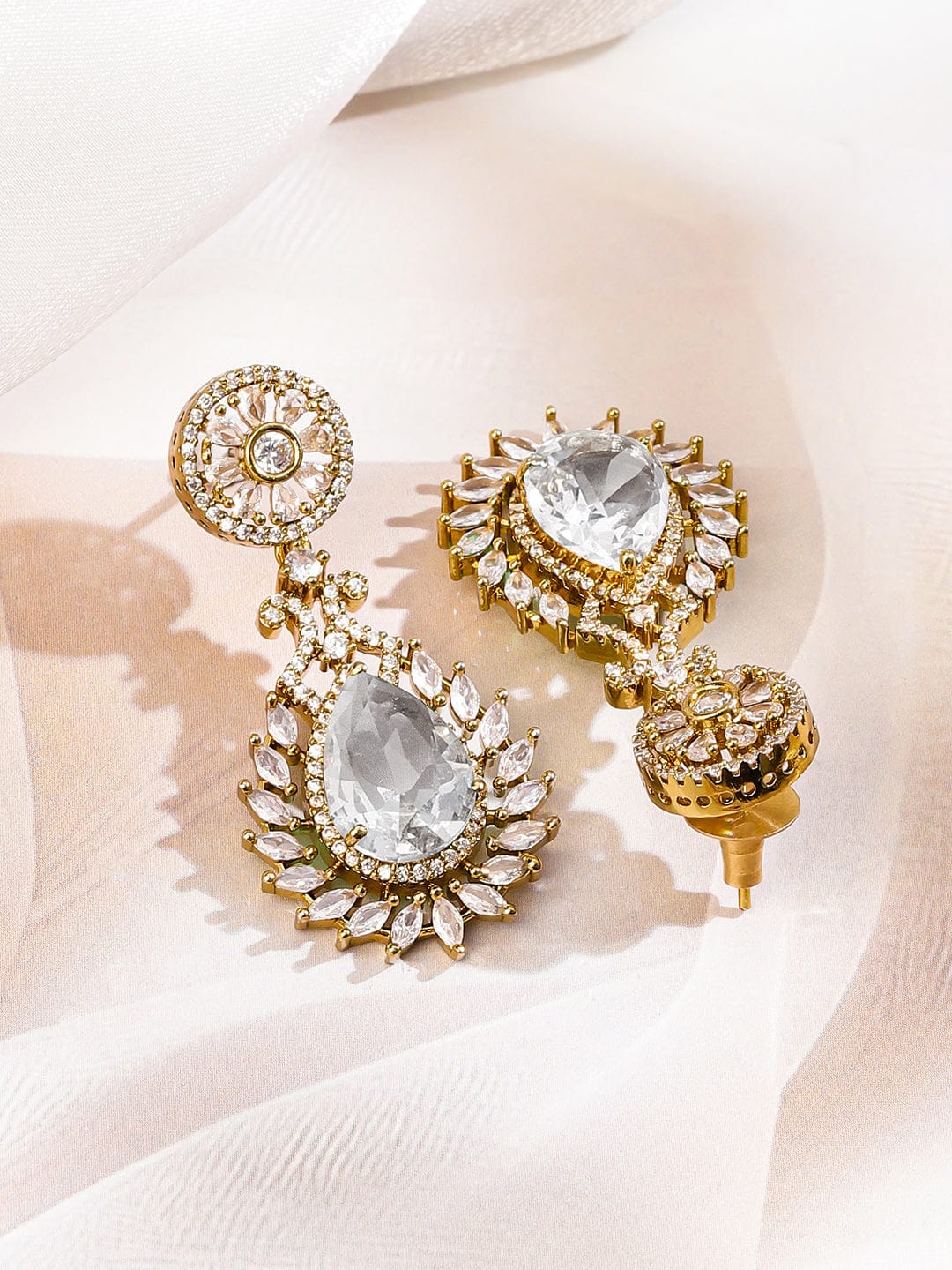 This 22K gold-plated necklace set features floral motifs with white sapphire-toned centre stones and white cubic zirconia, paired with matching earrings—ideal for festive and elegant looks for women & girls.