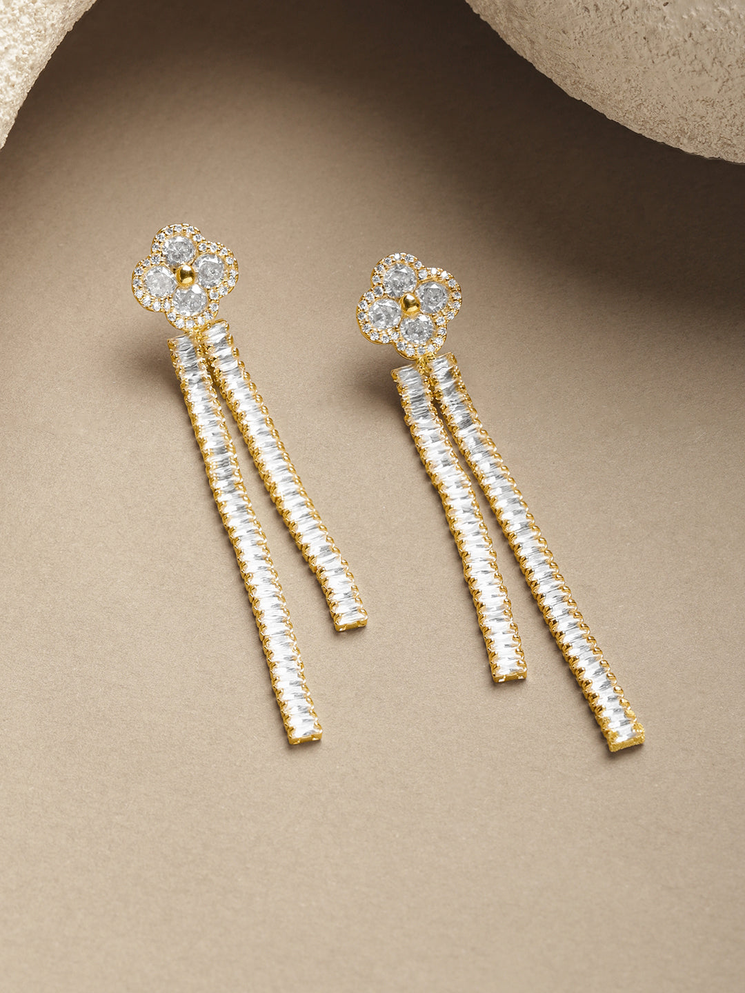 These Rubans Voguish 18K Gold Plated brass floral dangler earrings, adorned with crystal Cubic Zirconia stones, blend modern charm with timeless elegance — perfect for parties and festive wear.