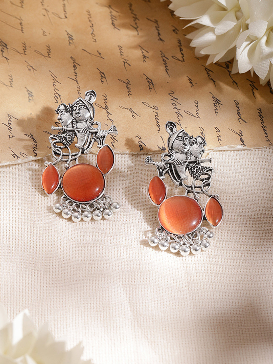 - • Design & Craftsmanship Oxidised drop earrings featuring traditional figurine motifs with orange detailing designed for ethnic statement looks