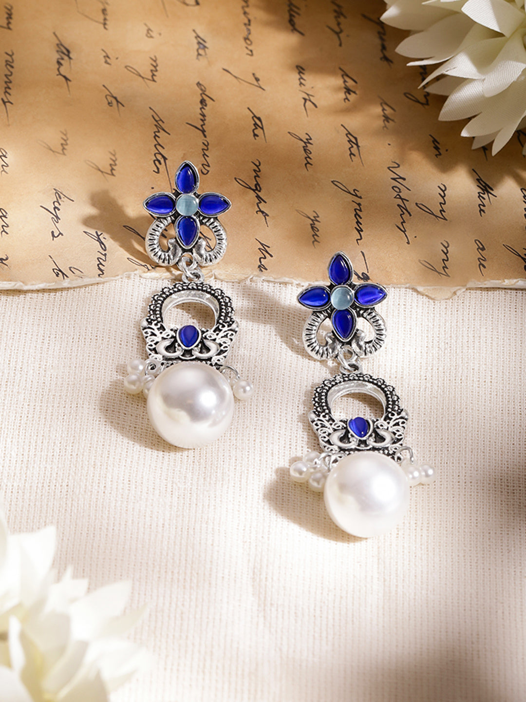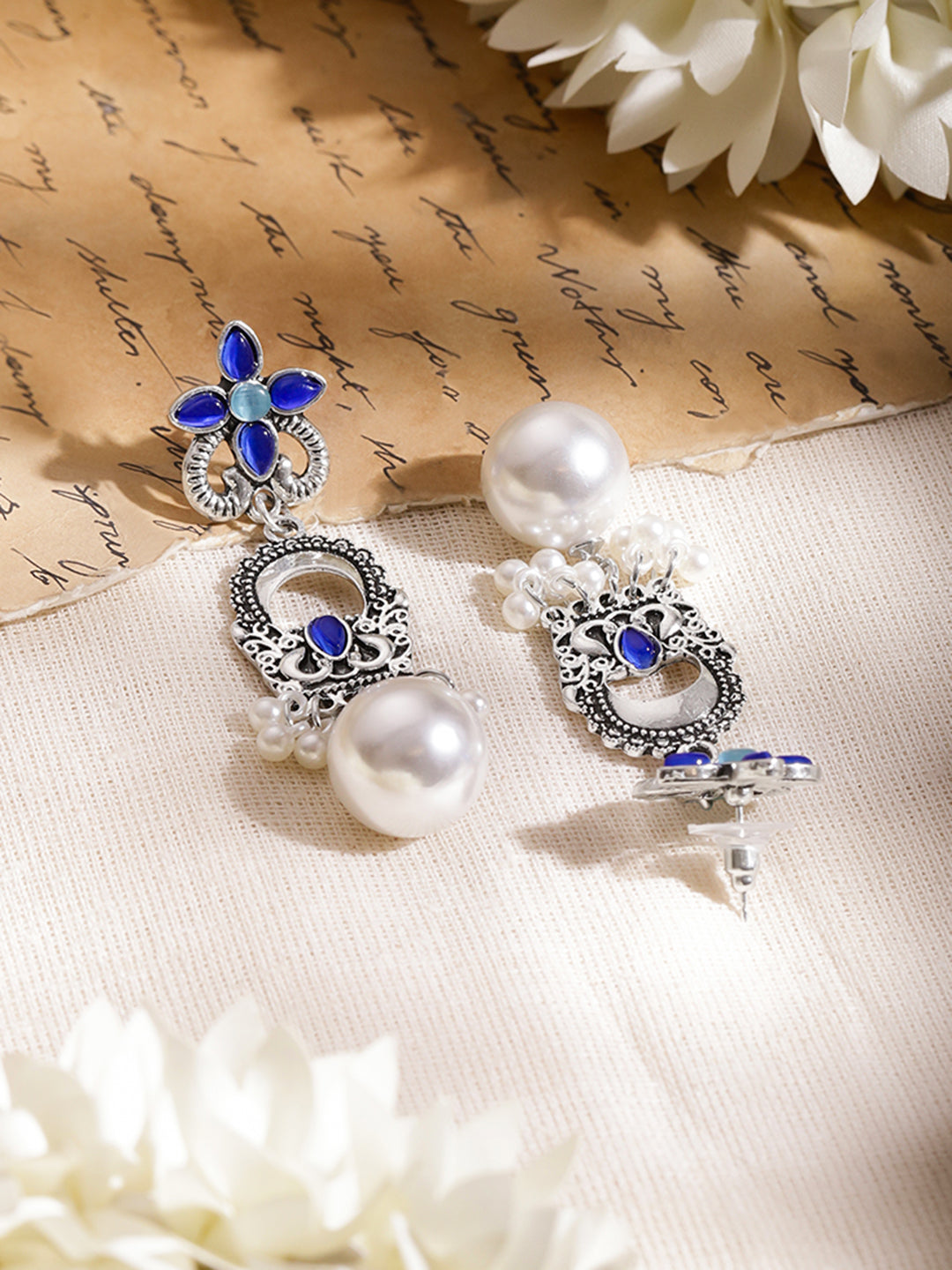 - • Design & Detailing Oxidised drop earrings featuring floral motifs with rich blue detailing and white pearl accents for a graceful statement look