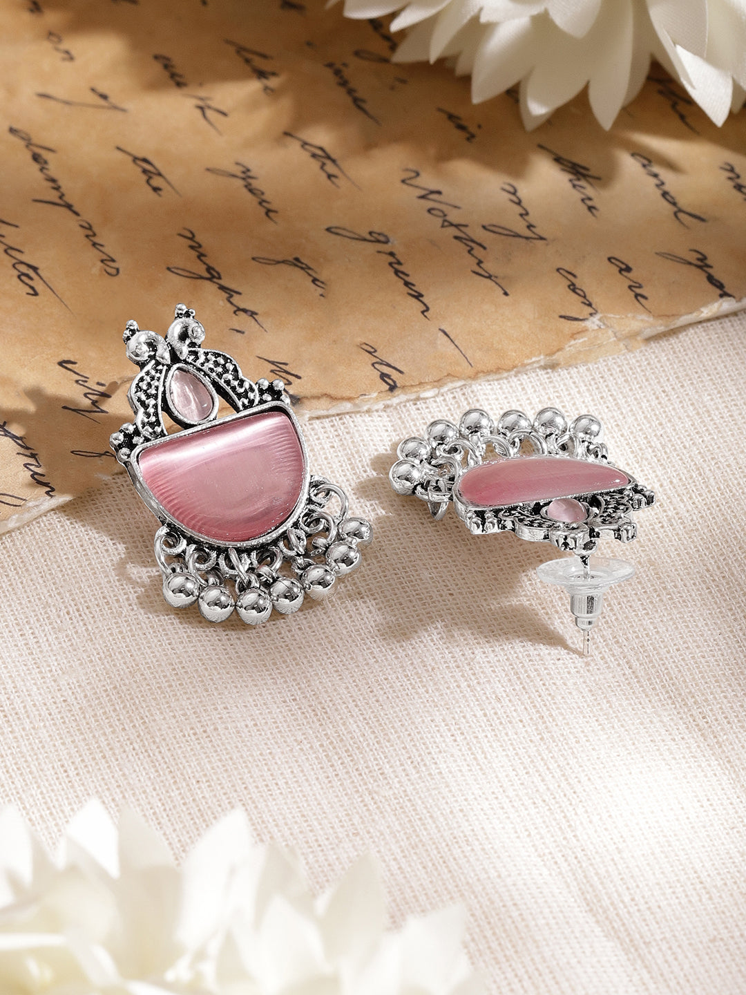 - • Design & Craftsmanship Oxidised drop earrings featuring layered motifs with pastel pink detailing for elegant ethnic statement styling