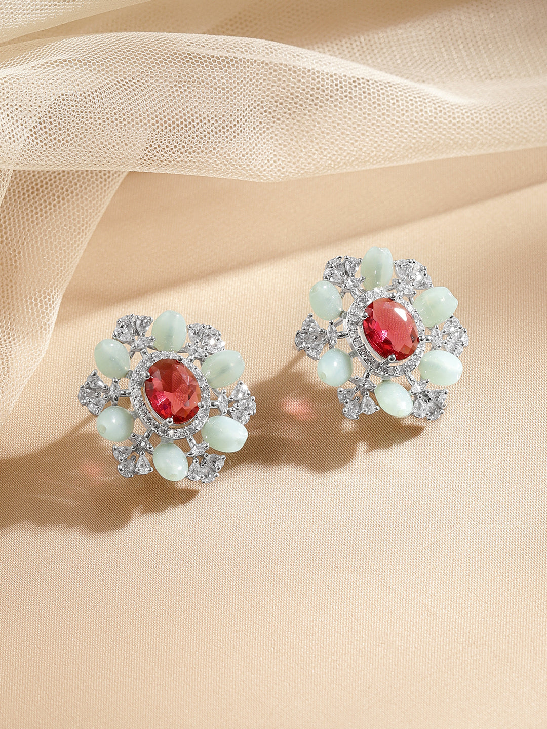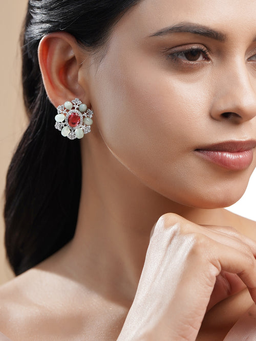 Rhodium plated brass studs featuring ruby red Cubic Zirconia, pastel green beads and sparkling accents in a floral silhouette, crafted for elegant festive and special occasion looks.