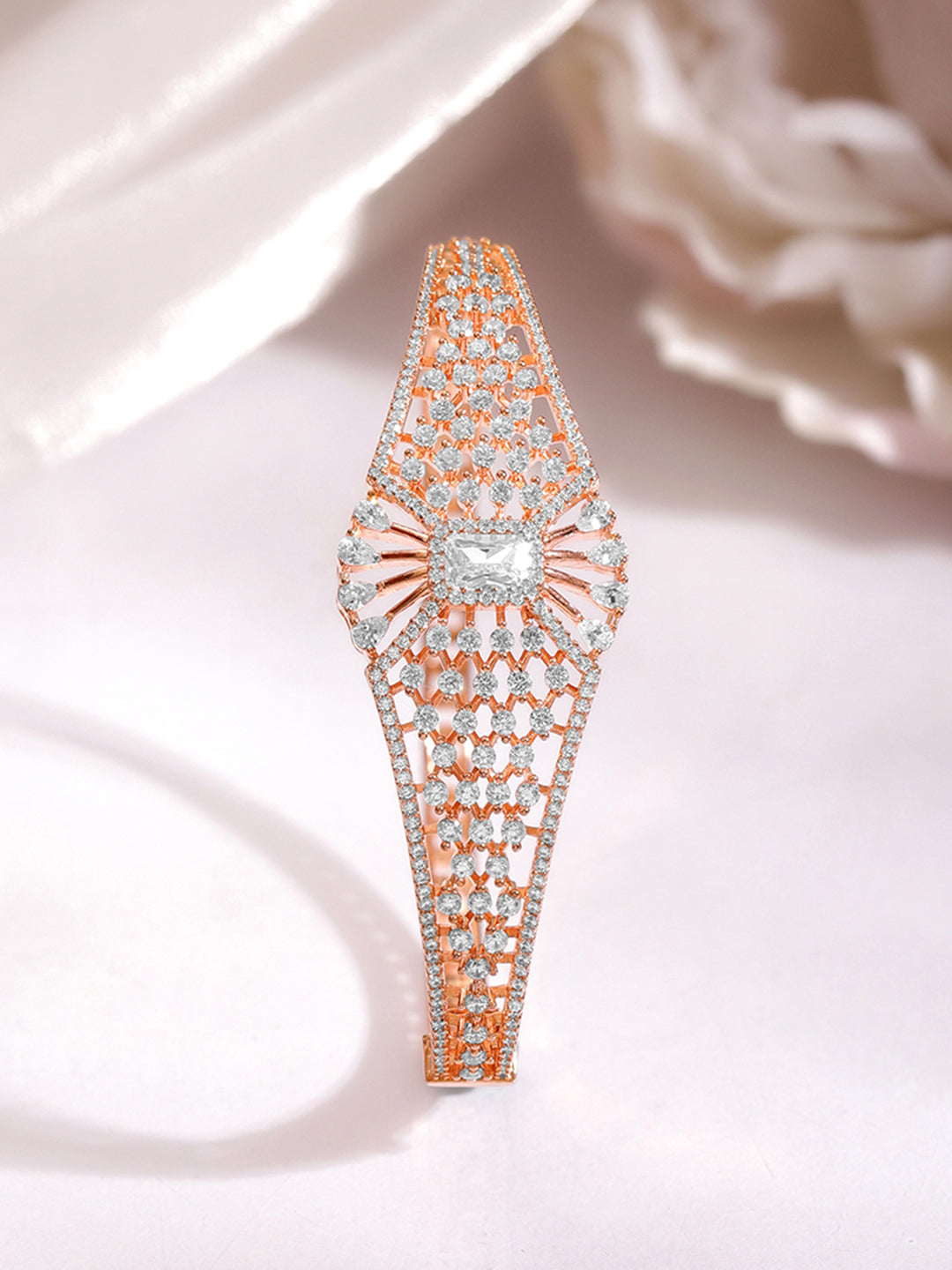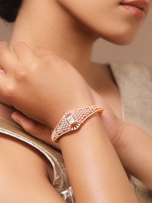 Rose Gold plated Brass bracelet embellished with sparkling Cubic Zirconia in a pavé setting offering brilliant shine and an elegant finish ideal for festive wedding and celebration looks.