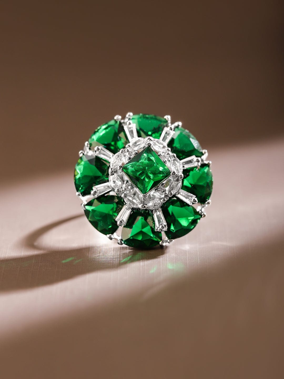 Rings : This rhodium-plated adjustable ring features a bold geometric design with a square-cut emerald green stone at the center, surrounded by round and baguette-cut white cubic zirconia, exuding elegance.