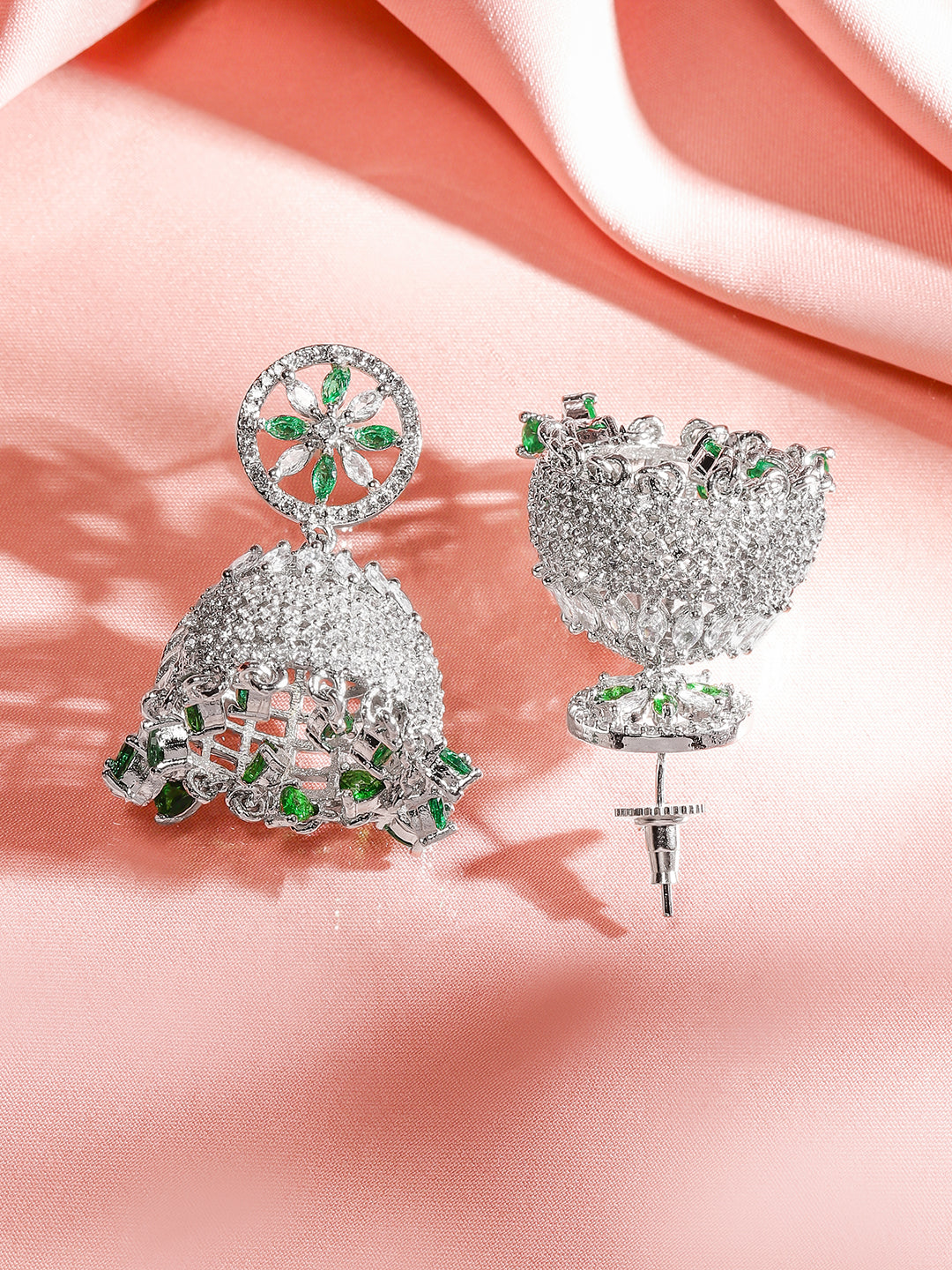 Earrings : These rhodium-plated jhumkas feature emerald green AD drop beads, Cubic Zirconia, and a floral stud top—perfect for enhancing ethnic looks during festive and special traditional occasions.