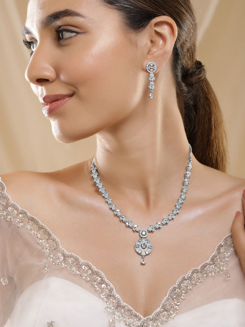 This Rubans premium rhodium plated necklace set features dazzling white cubic zirconia stones intricately arranged in a beautiful floral design. The necklace is complemented by matching drop earrings, each adorned with sparkling cubic zirconia accents. Perfect for special occasions, this high-quality set offers timeless beauty and a touch of glamour. Crafted with precision and care, it promises durability and lasting elegance, making it a treasured addition to your jewelry collection.