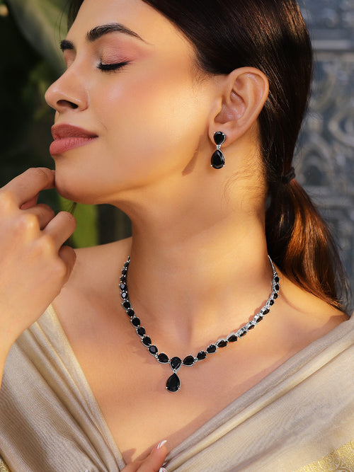 Necklace Set : This rhodium-plated necklace set features bold black onyx AD stones and dazzling cubic zirconia, paired with matching earrings for an elegant and luxurious statement look.