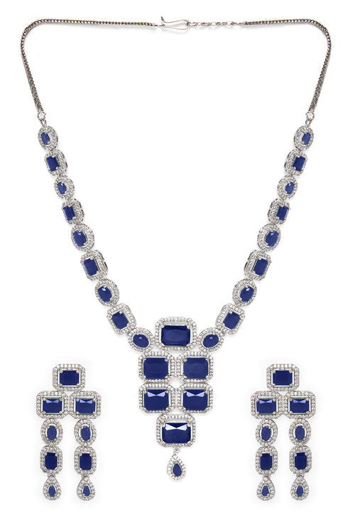 Rubans Rhodium Plated Blue Sapphire & CubicZirconia Studded Premium Statement Necklace Set Necklace Set