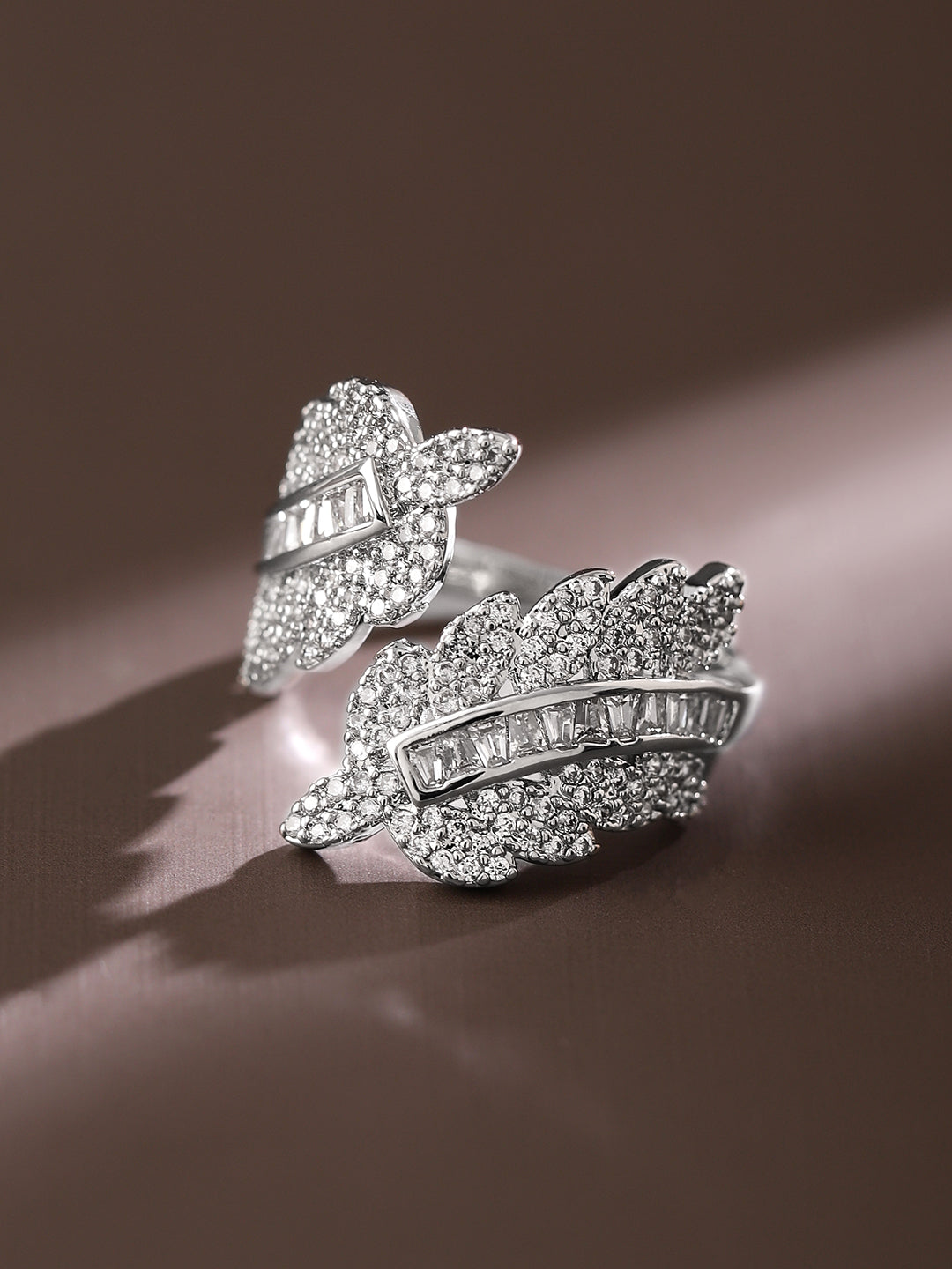 Ring : Enhance your elegance with this rhodium-plated adjustable finger ring, featuring a leaf-inspired design adorned with pavé and baguette-cut cubic zirconia for a luxurious statement look.