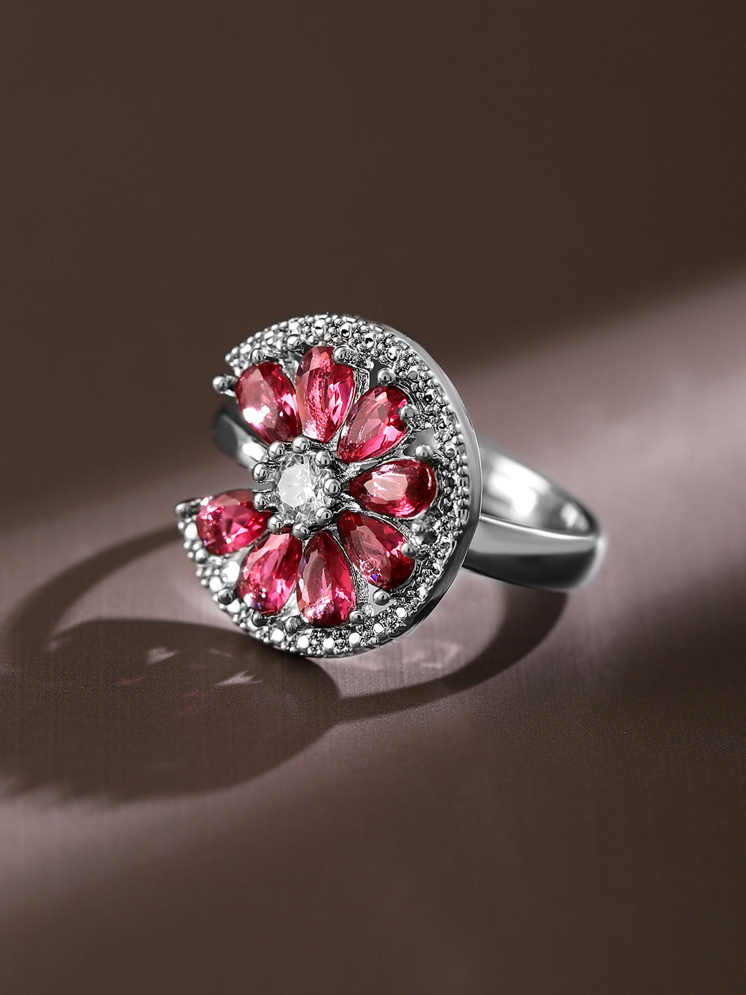 Ring : Enhance your elegance with this rhodium-plated openable statement ring, featuring a floral-inspired design with ruby pink stones and cubic zirconia detailing for a luxurious touch.