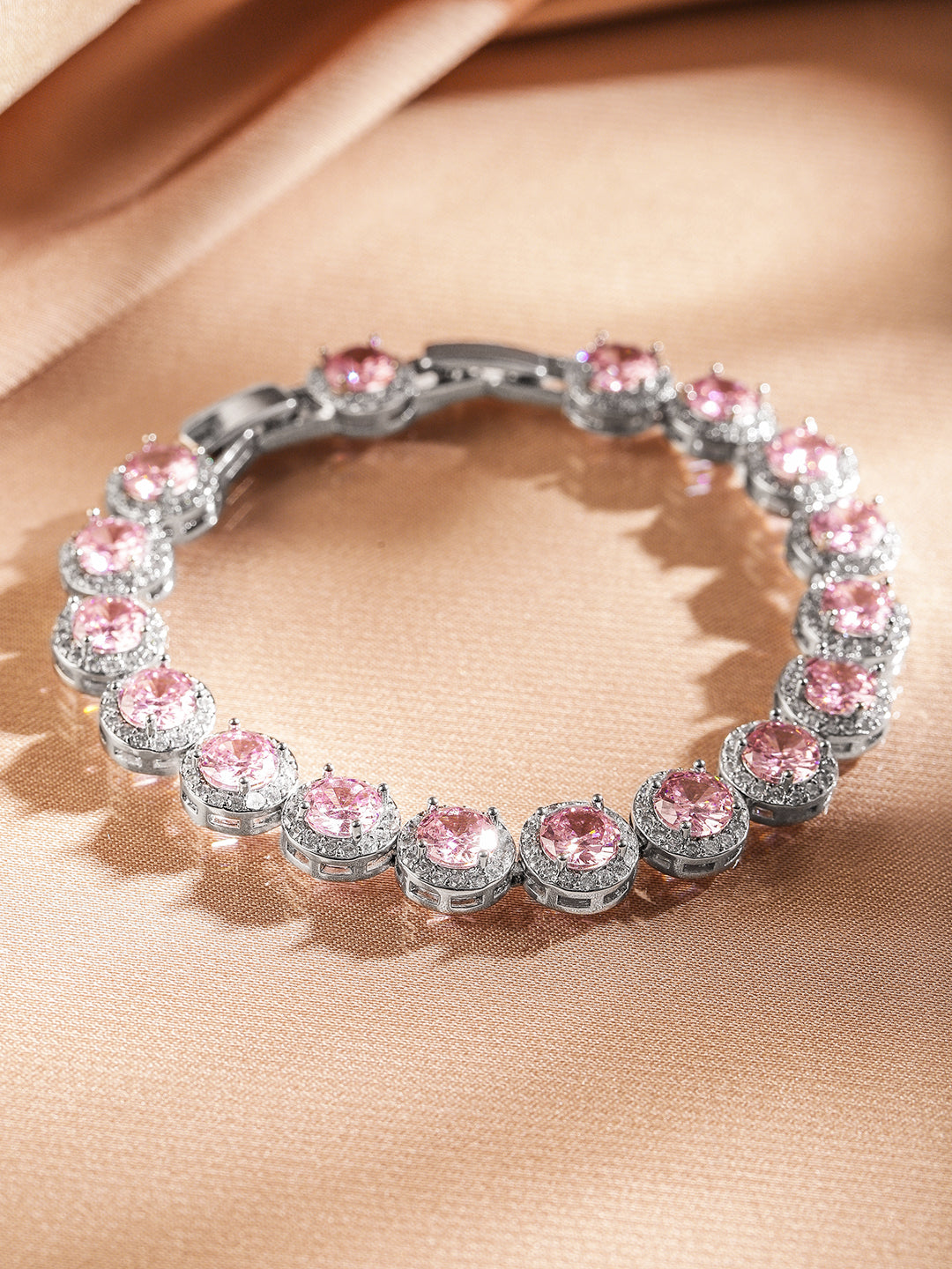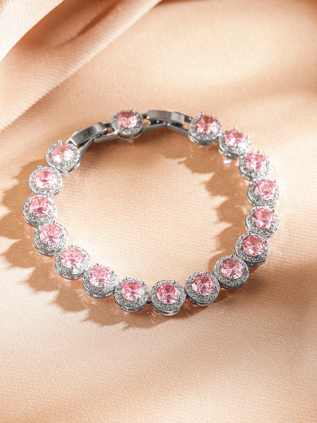 Share on WhatsappRubans Rhodium Plated Sparkling pink round-cut Cubic Zirconia Studded Premium Tennis Bracelet