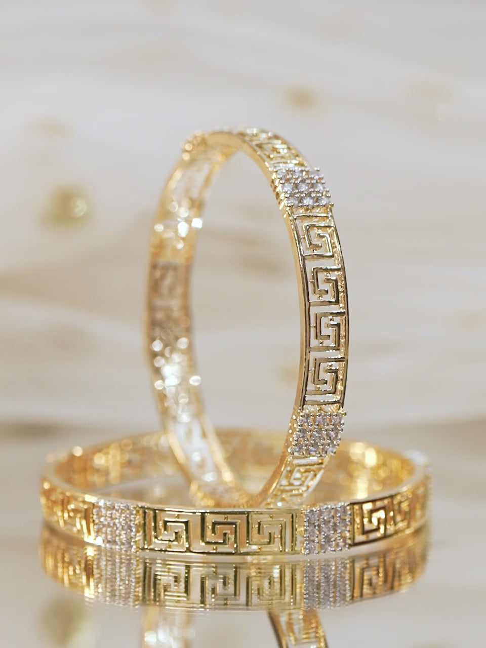 Exquisitely designed set of 2 22K gold-plated handcrafted bangles featuring a Greek key pattern and sparkling cubic zirconia accents. A perfect blend of elegance and intricate artistry.