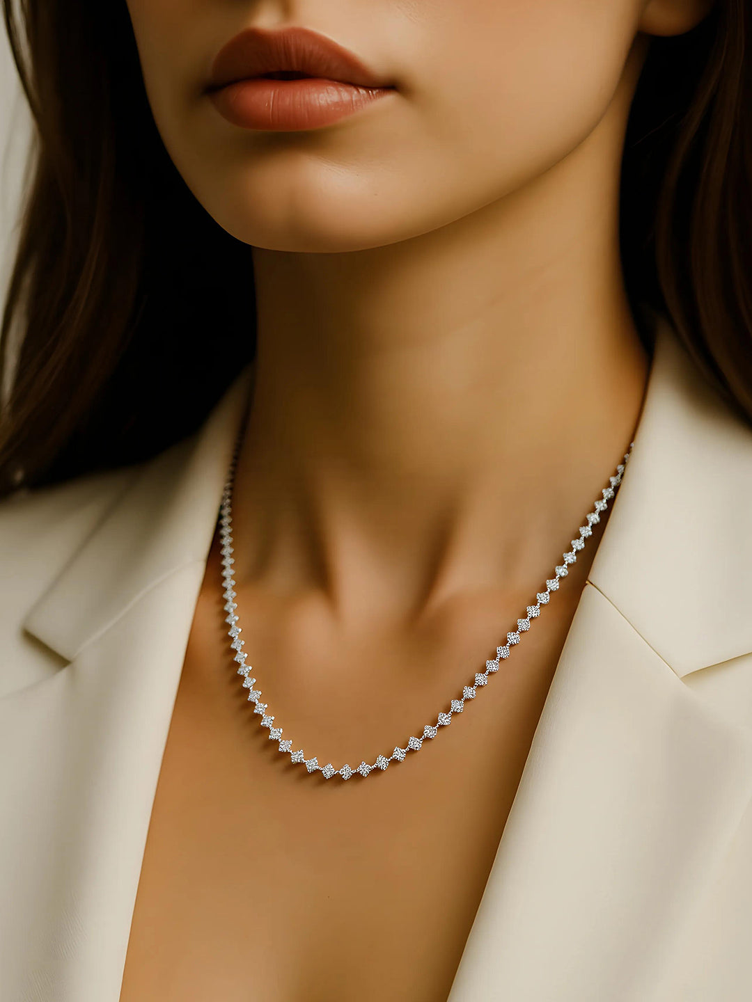 This rhodium-plated necklace features a classic tennis design with white cubic zirconia stones in a symmetrical setting. A timeless piece for elegant parties and modern festive looks.
