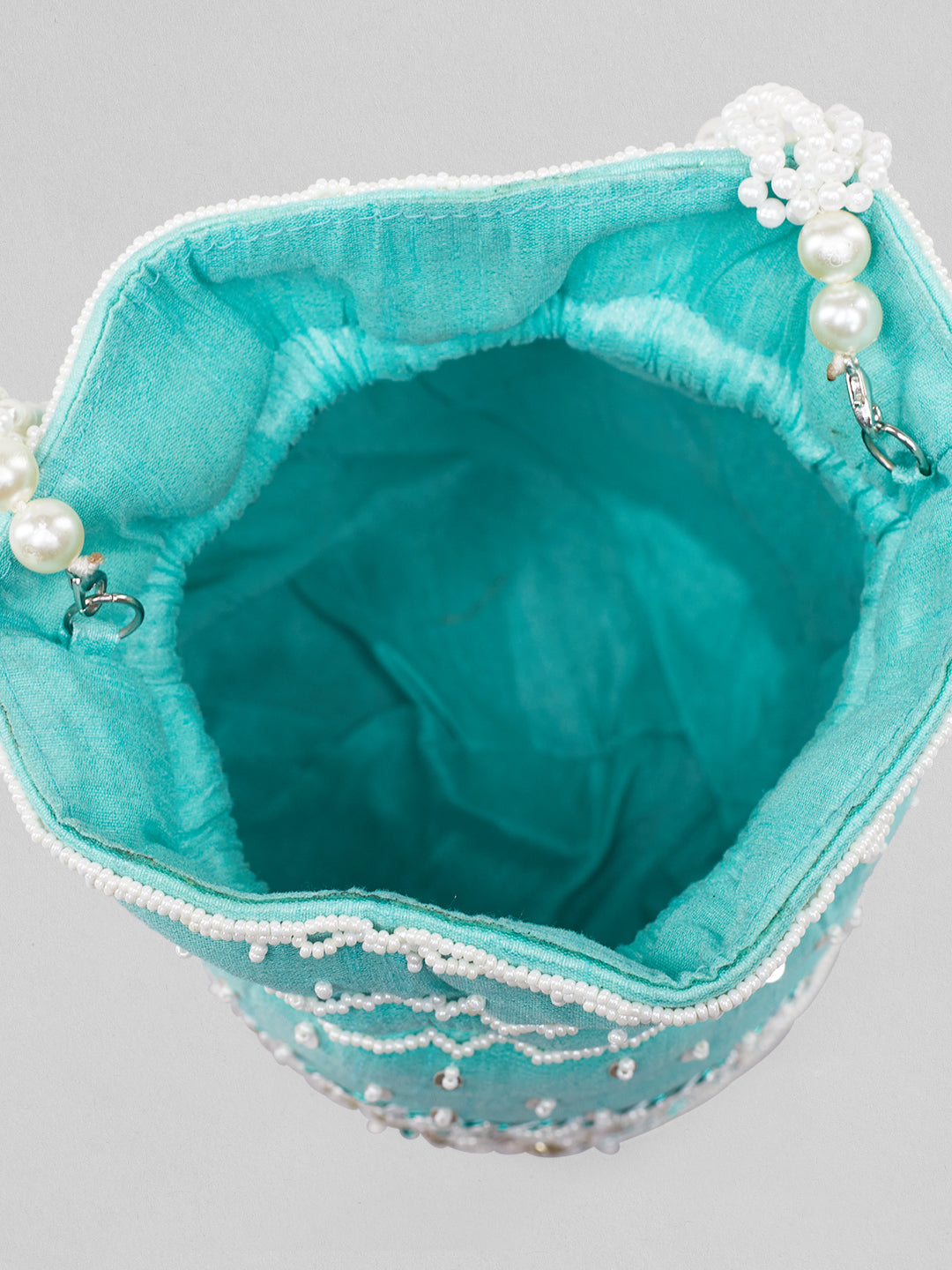 Rubans Mint Coloured Potli Bag With Golden And White Embroided Design.