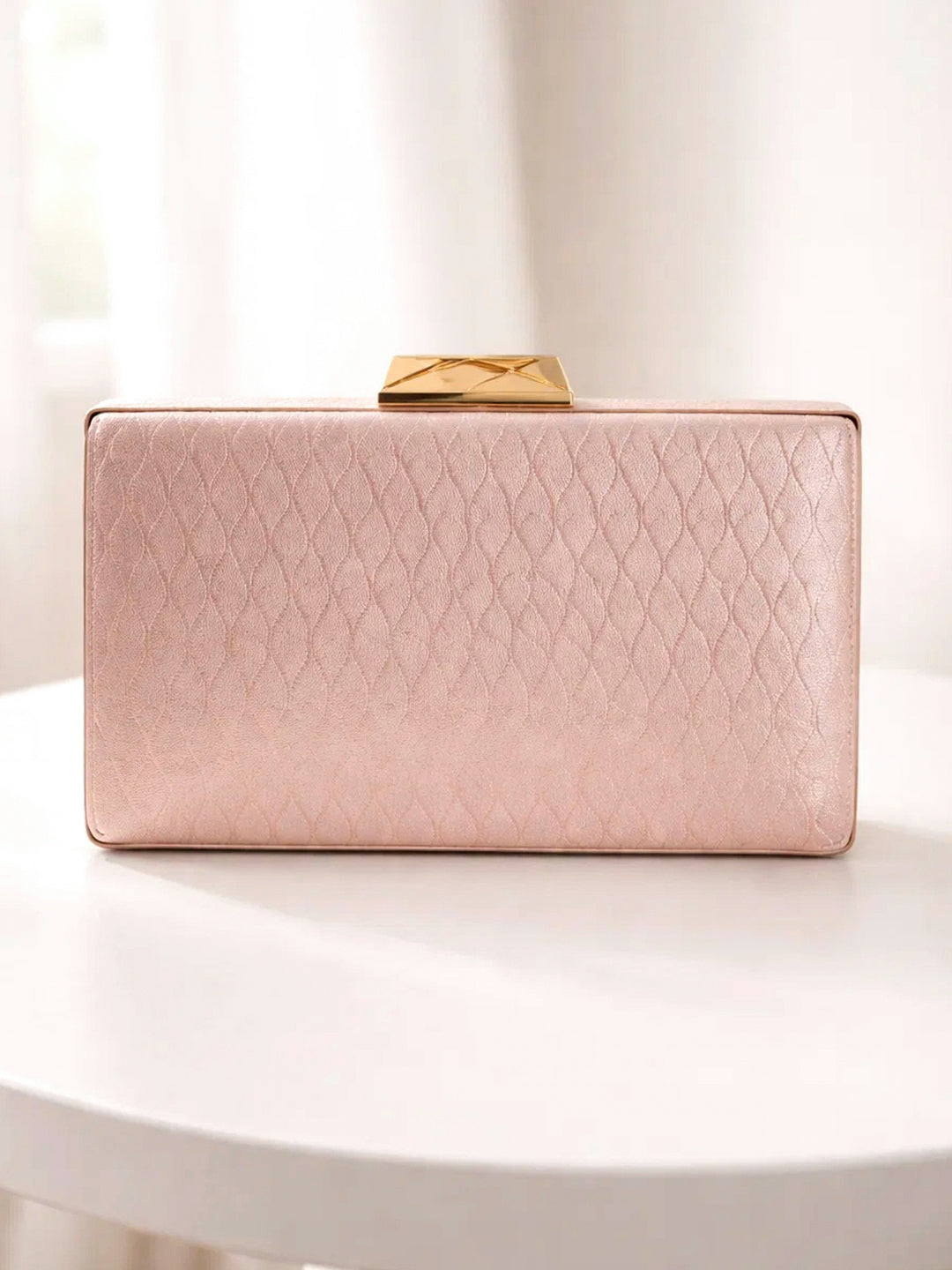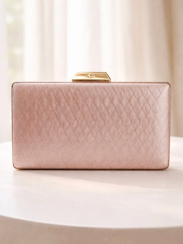 Designed with a structured metal frame and shimmer fabric finish this beige gold box clutch comes with a detachable chain strap offering elegant styling for weddings festive evenings and celebrations.