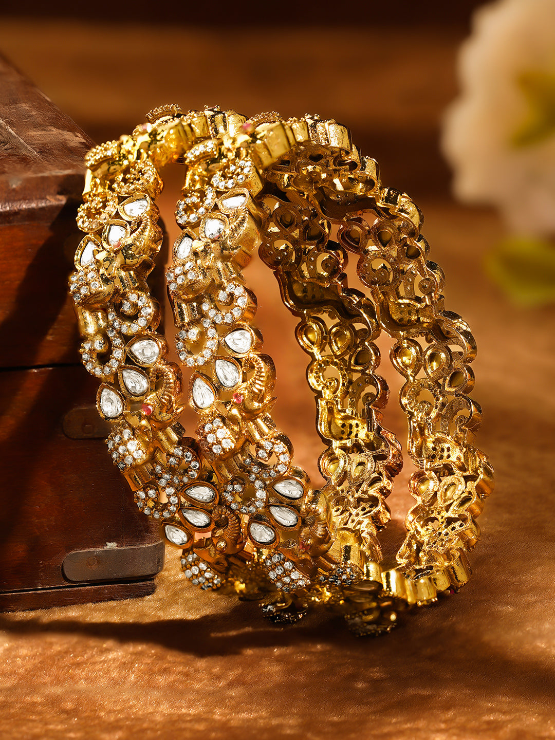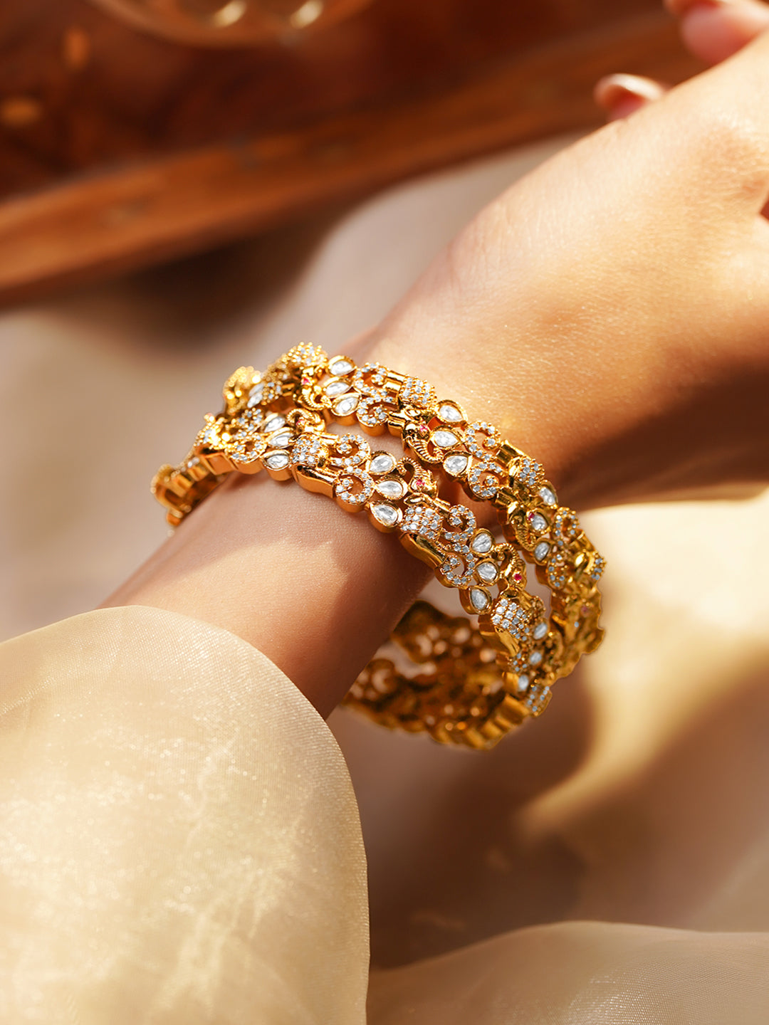 Crafted in 18K Gold plated Brass this set of two bangles features ornate traditional motifs highlighted with white Cubic Zirconia accents offering refined brilliance for weddings and festive occasions