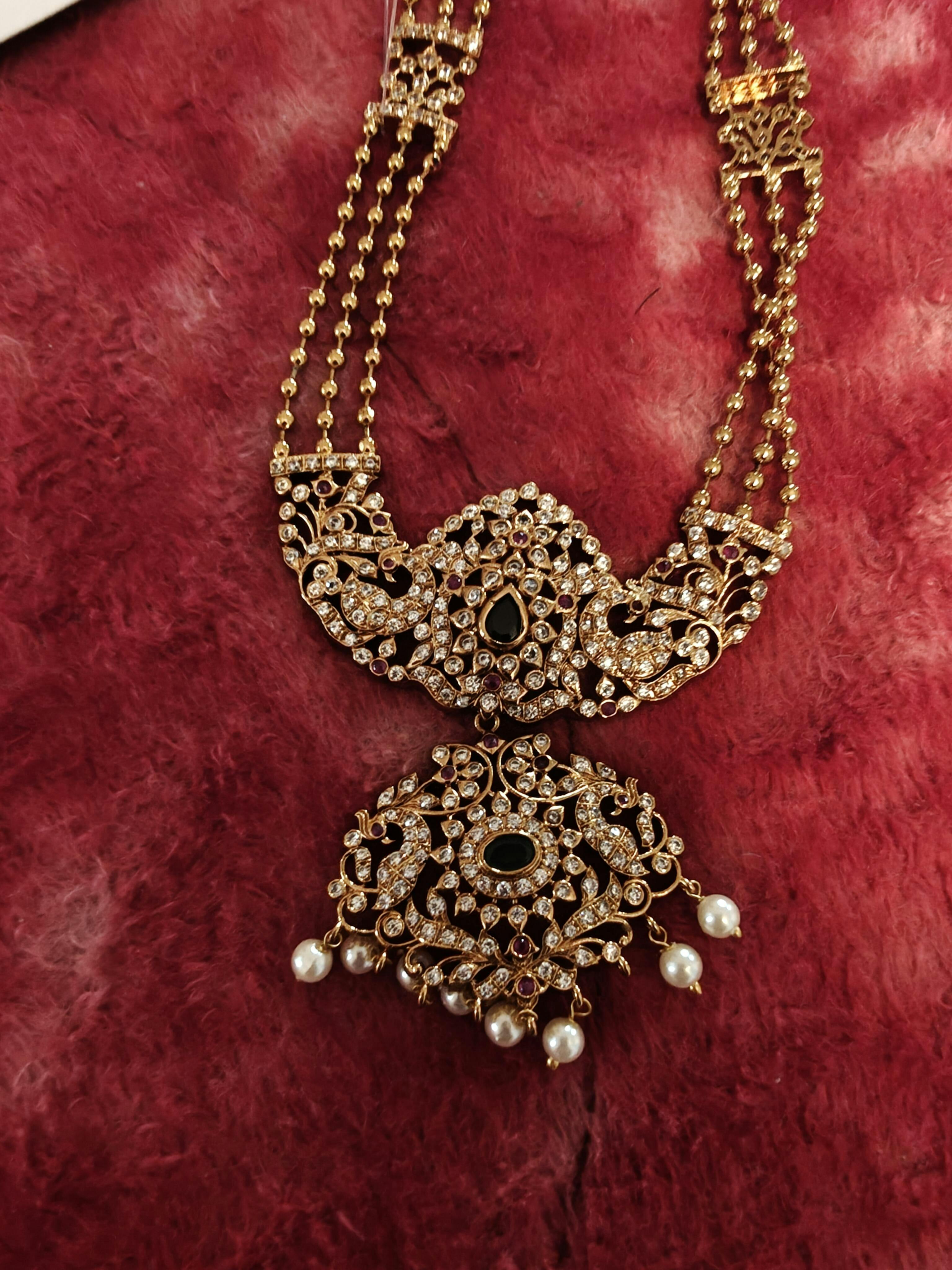 Adorn yourself with the splendor of this temple-inspired necklace set from Rubans Accessories. Crafted in captivating gold tone, it features a harmonious arrangement of green, pink, and white stones, creating a breathtaking fusion of colors. This set exudes a sense of grandeur and cultural elegance, making it a statement piece for special occasions and celebrations. Elevate your style with this opulent ensemble that pays homage to tradition while embracing contemporary sophistication.
