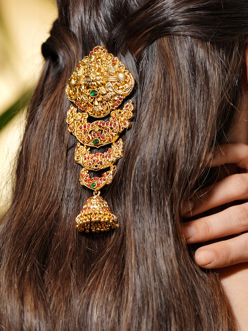 This Rubans 22K gold-plated brass temple hair accessory, embellished with ruby red and green stones, radiates traditional charm and divine craftsmanship — perfect for bridal and festive looks.