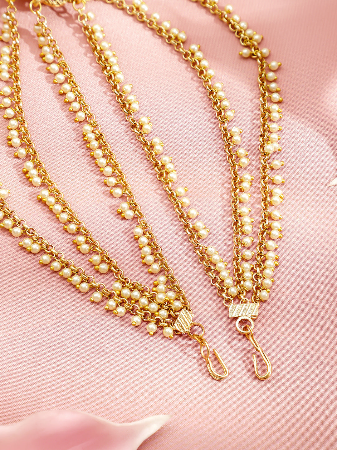 - Layered Pearl Chains: Adorned with delicate pearl clusters that drape beautifully on the hair.