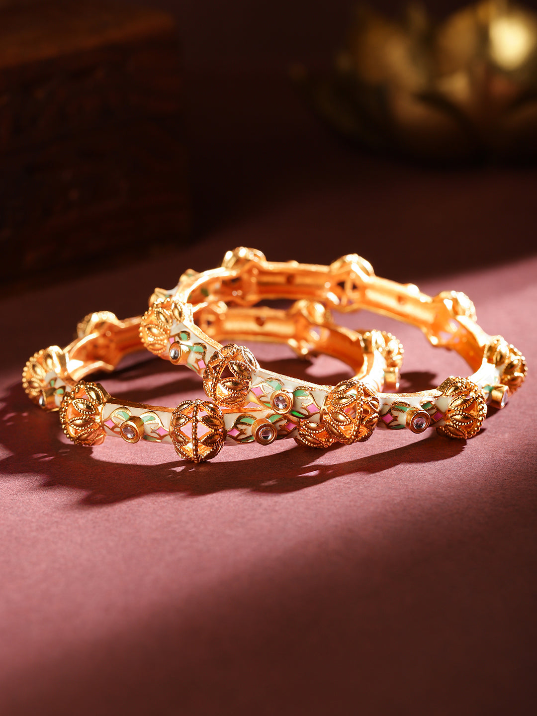 Bangles & Bracelet : Elevate your ethnic elegance with this set of 2 handcrafted 18K gold-plated bangles featuring exquisite white and green enamel detailing with dazzling kundan stones. The intricate filigree beadwork enhances its regal charm, making it a perfect addition to your traditional collection.