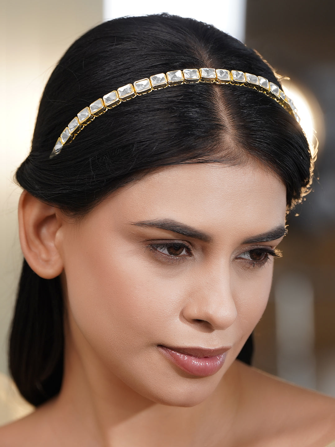 A 22K Gold plated Brass hairband embellished with sparkling kundan square stones, offering elegant shine suitable for bridal, festive and modern party hairstyles.