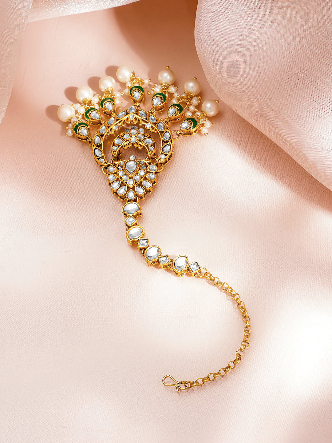 Crafted in 22K Gold plated Brass with classic kundan detailing, green enamel accents and white pearl drops this maang tikka adds refined elegance to bridal and festive traditional looks