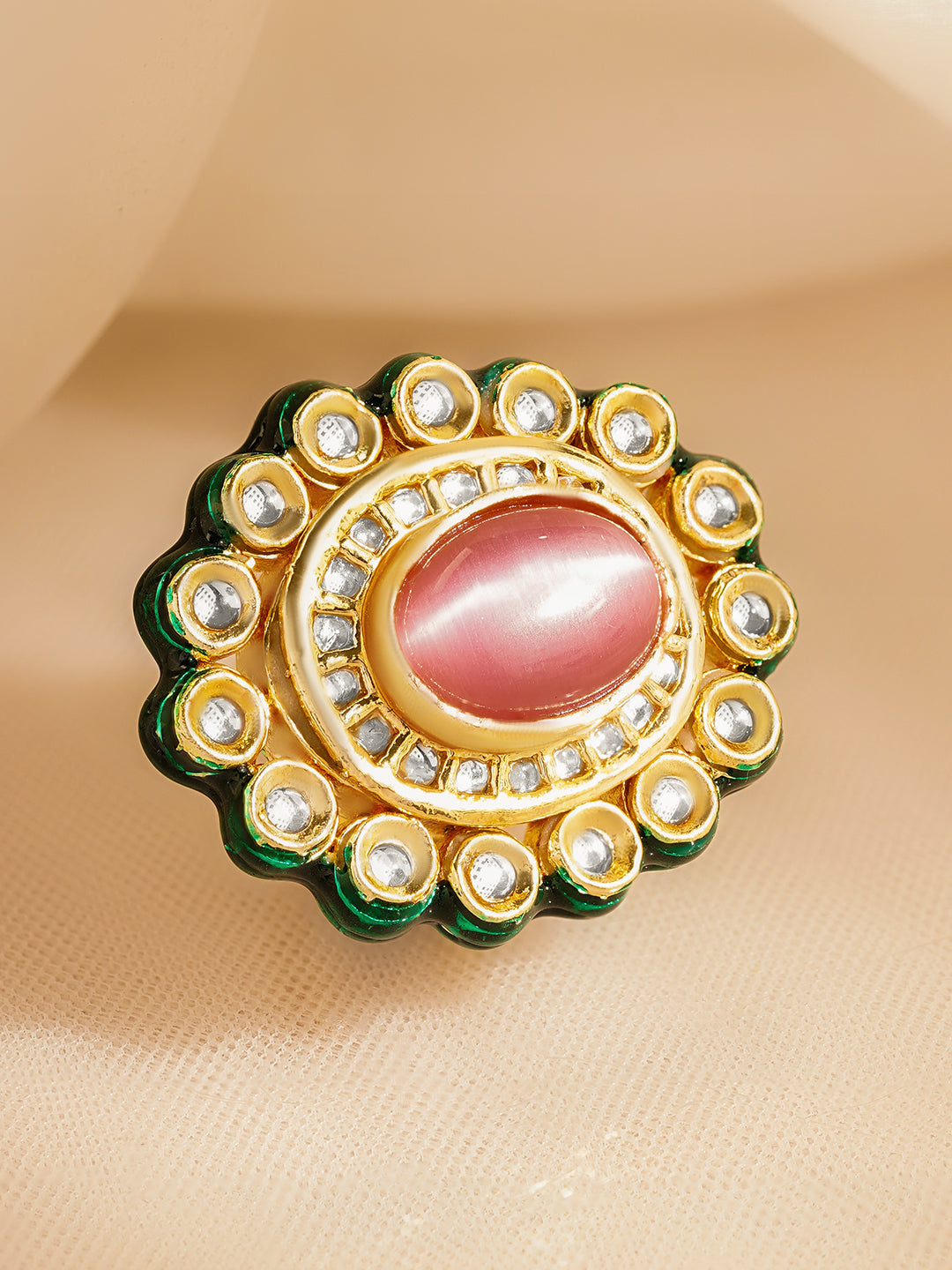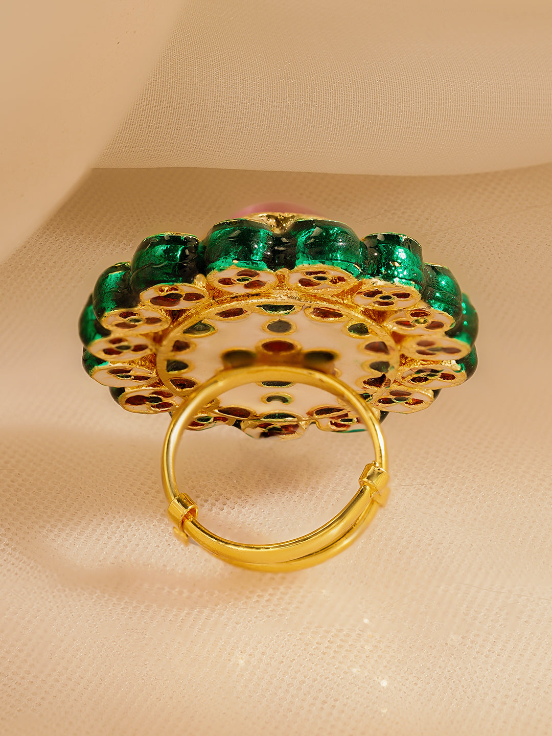 Rubans Gold-Plated Kundan Adjustable Ring with Pink Stone & Green Enamel Statement Design for Women & Girls, Ethnic Wedding Jewellery, Festive Wear, Traditional Accessories, Handmade Royale Ring