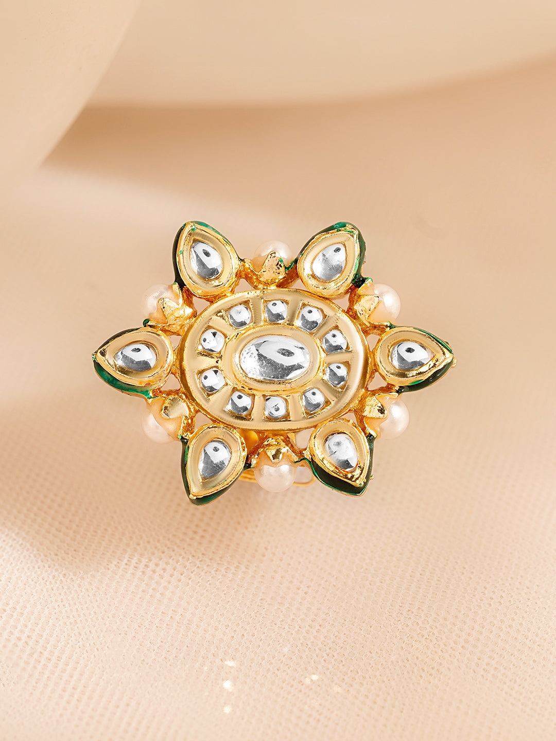 - Kundan-Crafted Elegance Premium gold-plated brass ring adorned with traditional kundan stones for a rich ethnic look