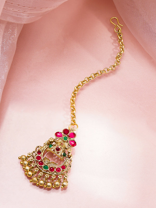 Crafted in 18K Gold plated Brass, this traditional maangtikka features ruby red and emerald green detailing with delicate Gold bead drops, offering timeless elegance for bridal and festive styling.