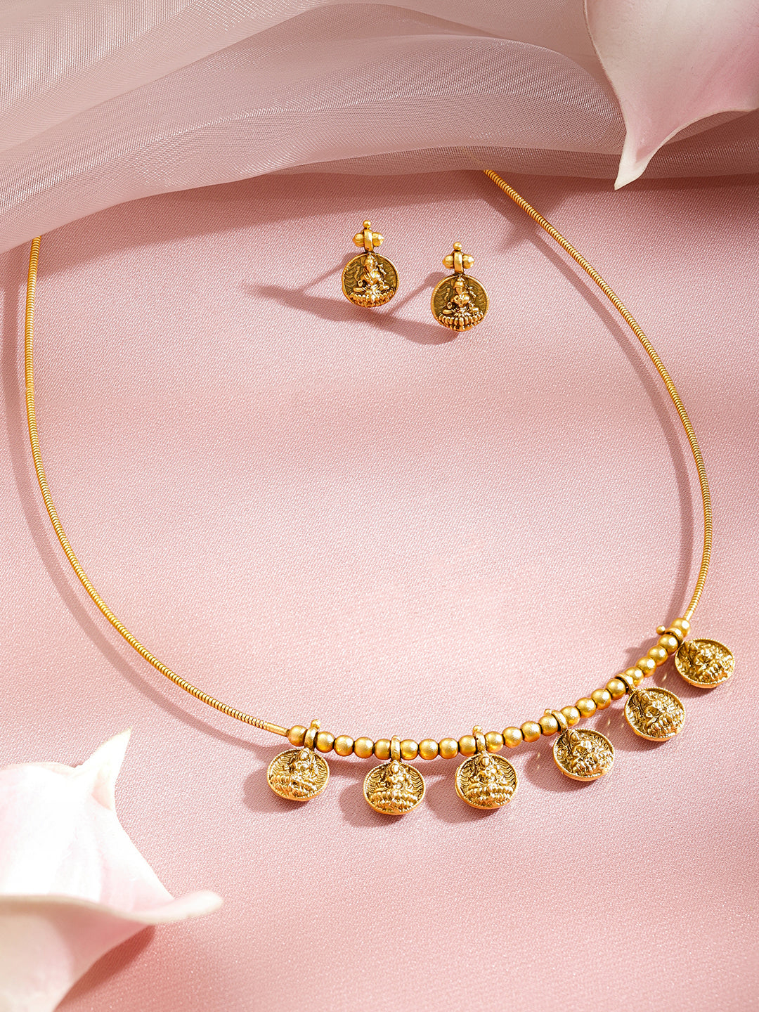 Rubans 18K Gold Plated Temple Coin Charm Short Necklace Set crafted in Brass with Embossed Temple Motifs Traditional Daily & Festive Jewellery for Women & Girls