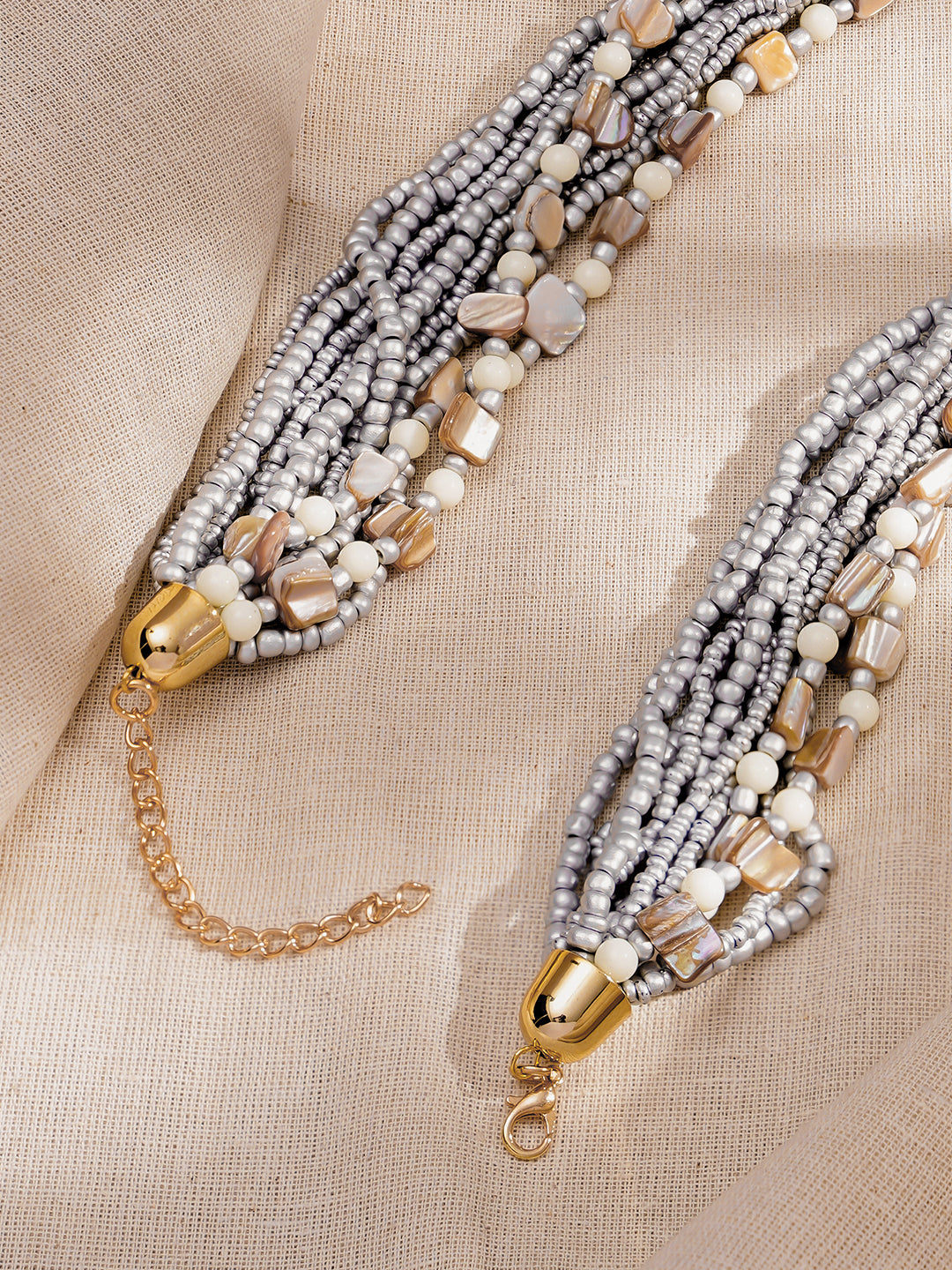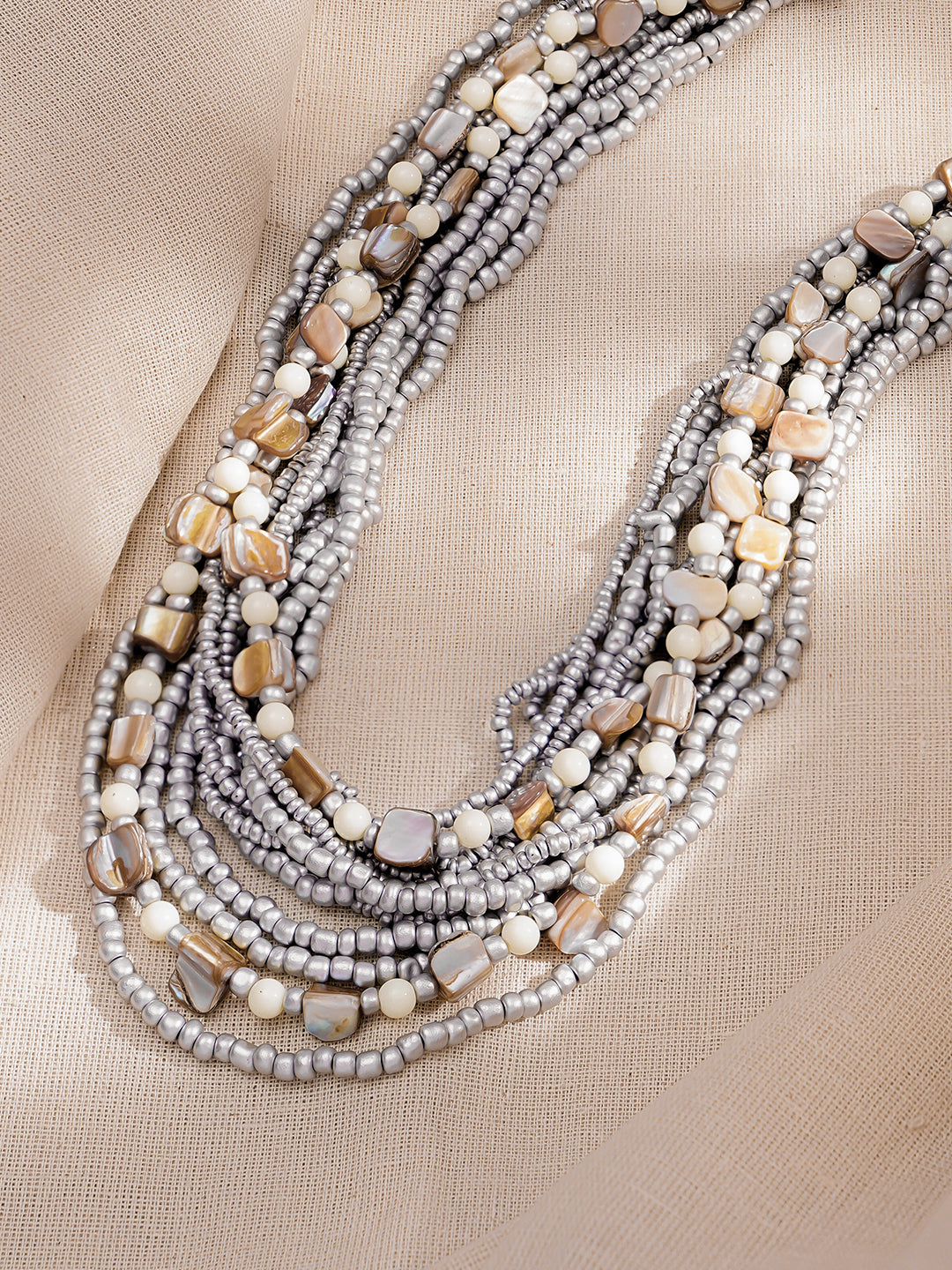 - Statement Layers: Features multiple strands of silver and beige beads for rich visual depth
