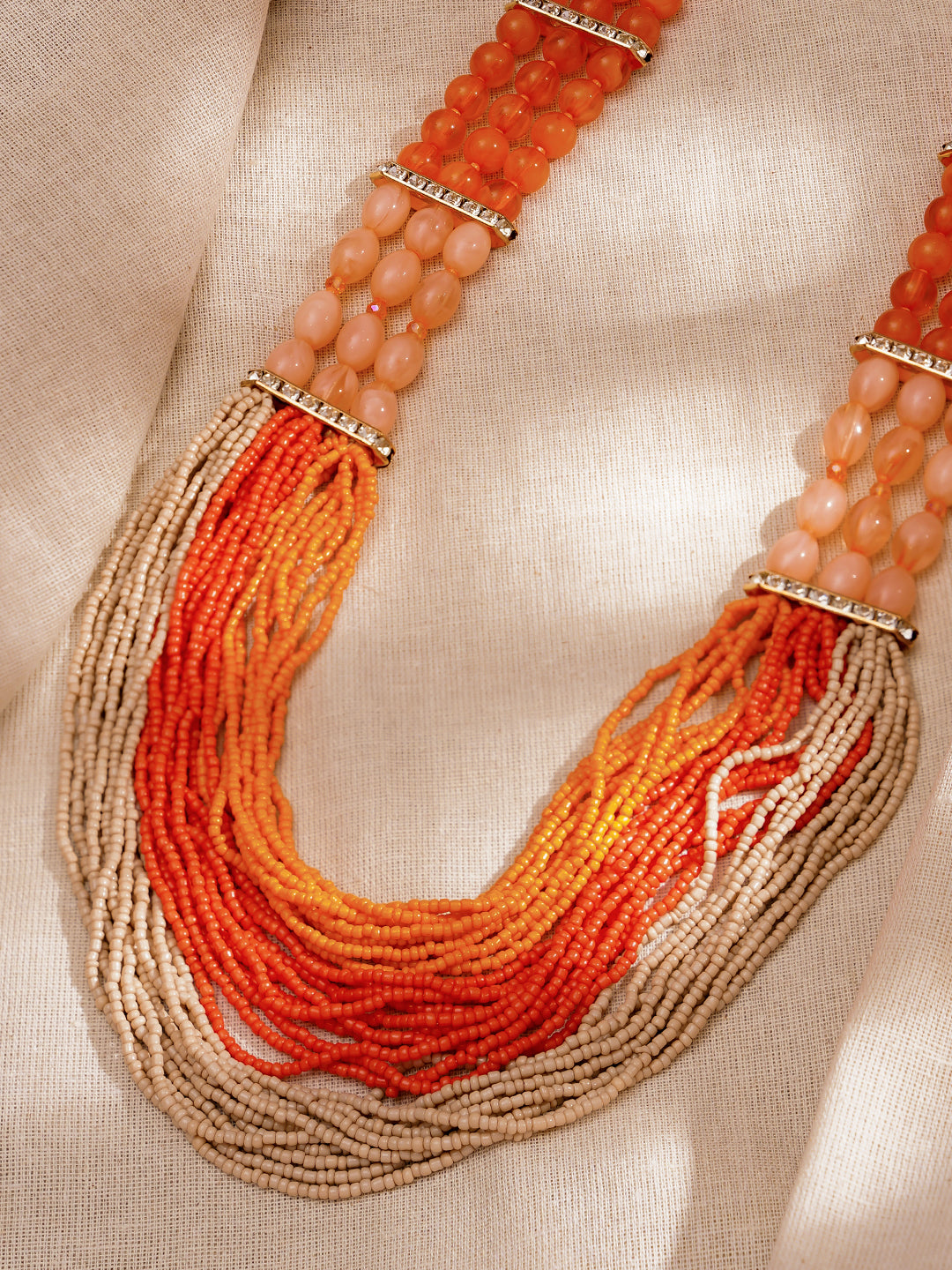 Crafted in Brass with multicolour orange, peach and neutral beads, this layered statement necklace offers a vibrant, bold and stylish accent perfect for festive, party and contemporary everyday looks.