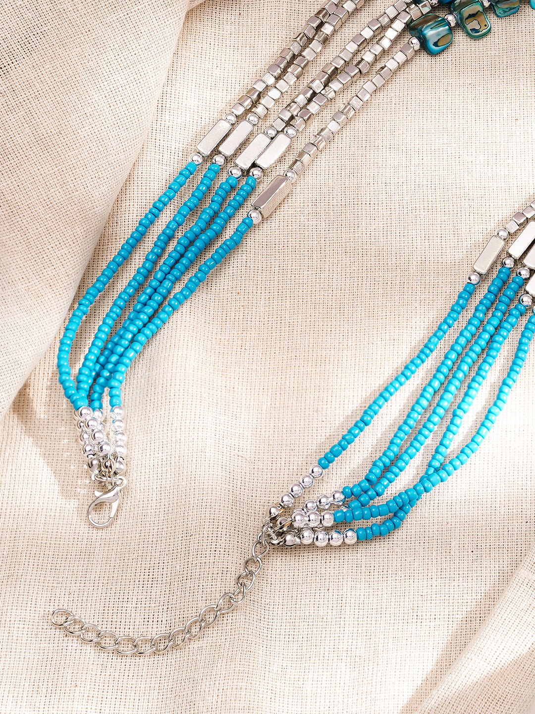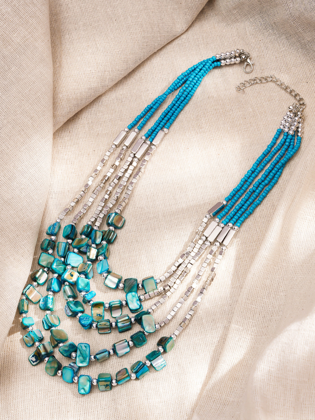 A striking aqua blue multilayer beaded necklace crafted in Brass, featuring glossy cube and seed beads with silver accents, offering a bold modern statement for festive, casual and vacation looks.