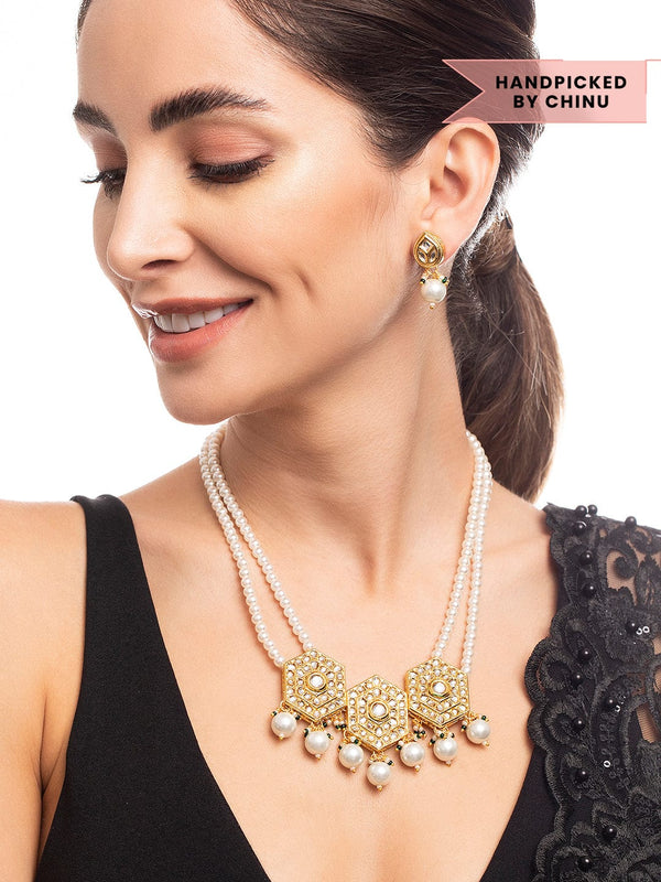 Rubans 22K Gold Plated Pendant Kundan Necklace Set With Pearls