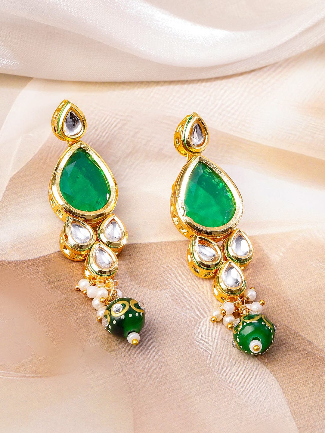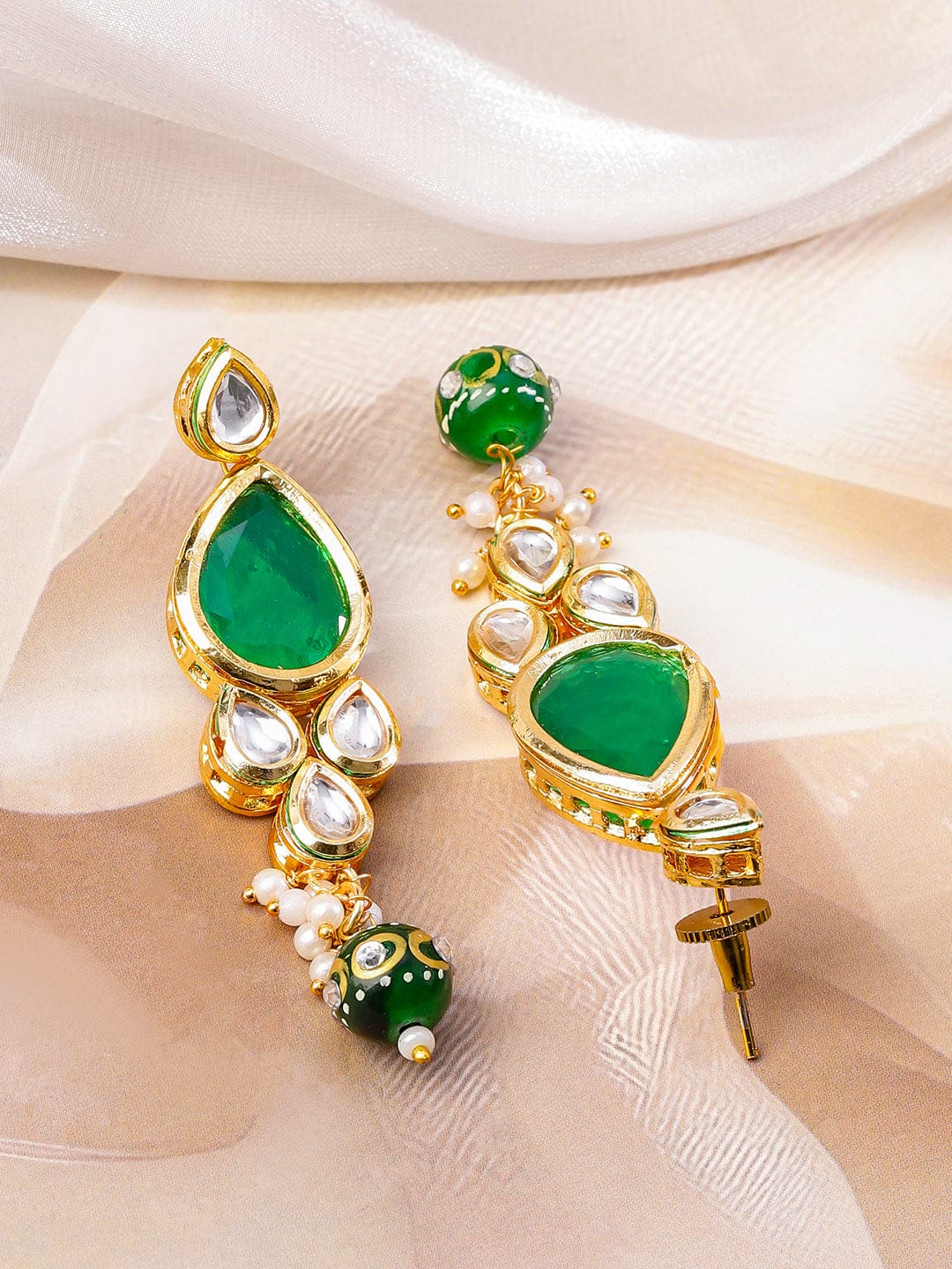 This 22K gold-plated handcrafted choker set features emerald green kundan stones, glossy green beads, and cream pearl drops with a regal layout. Designed for women, perfect for weddings and festive celebrations.