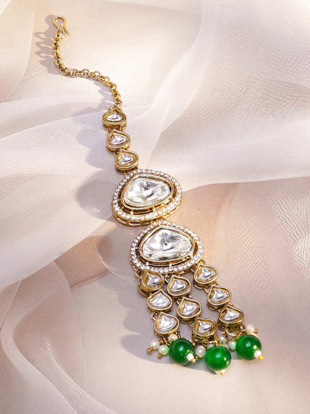 Jewellery Set: This 22K gold-plated handcrafted necklace set features white kundan and Cubic Zirconia, emerald green bead drops, and matching jhumka earrings with maangtikka . Made in premium brass material for bridal and festive occasions.