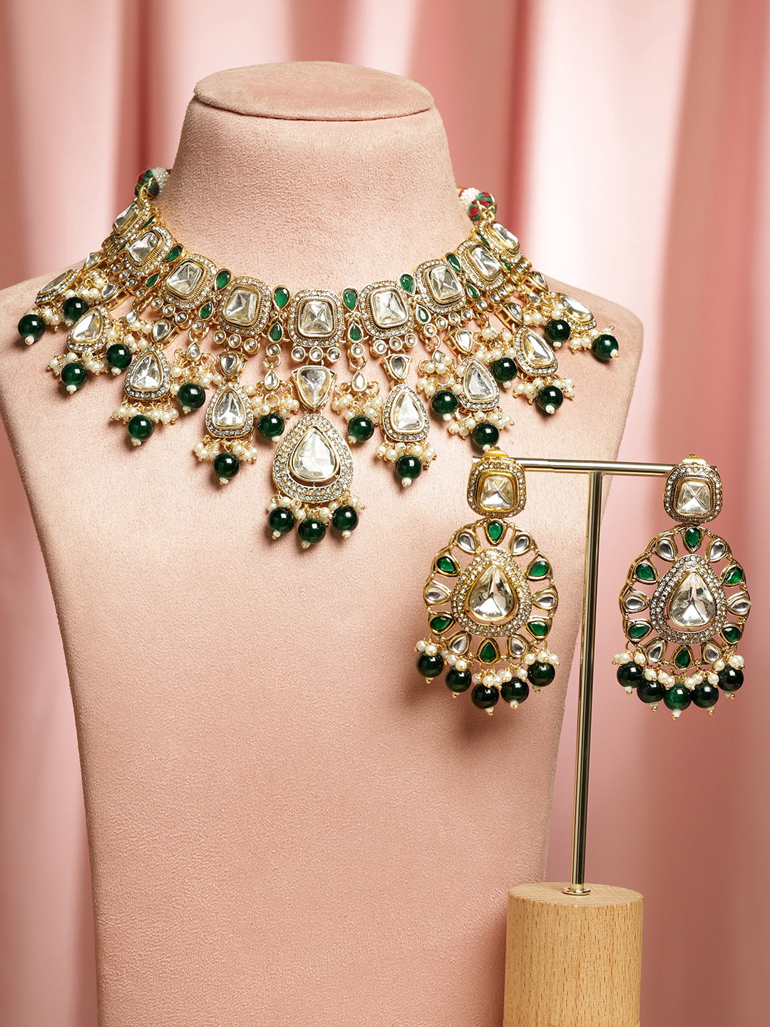 Jewellery Set: This Rubans 22K gold-plated handcrafted necklace set features white Kundan, Cubic Zirconia, and green pearl beads, designed to add regal charm for weddings, festive occasions, and grand celebrations.
