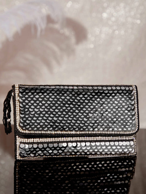 Rubans Silver Colour Clutch With Black Embroided Design.