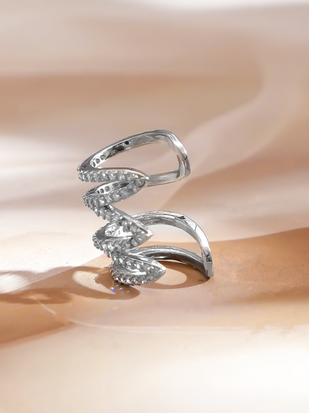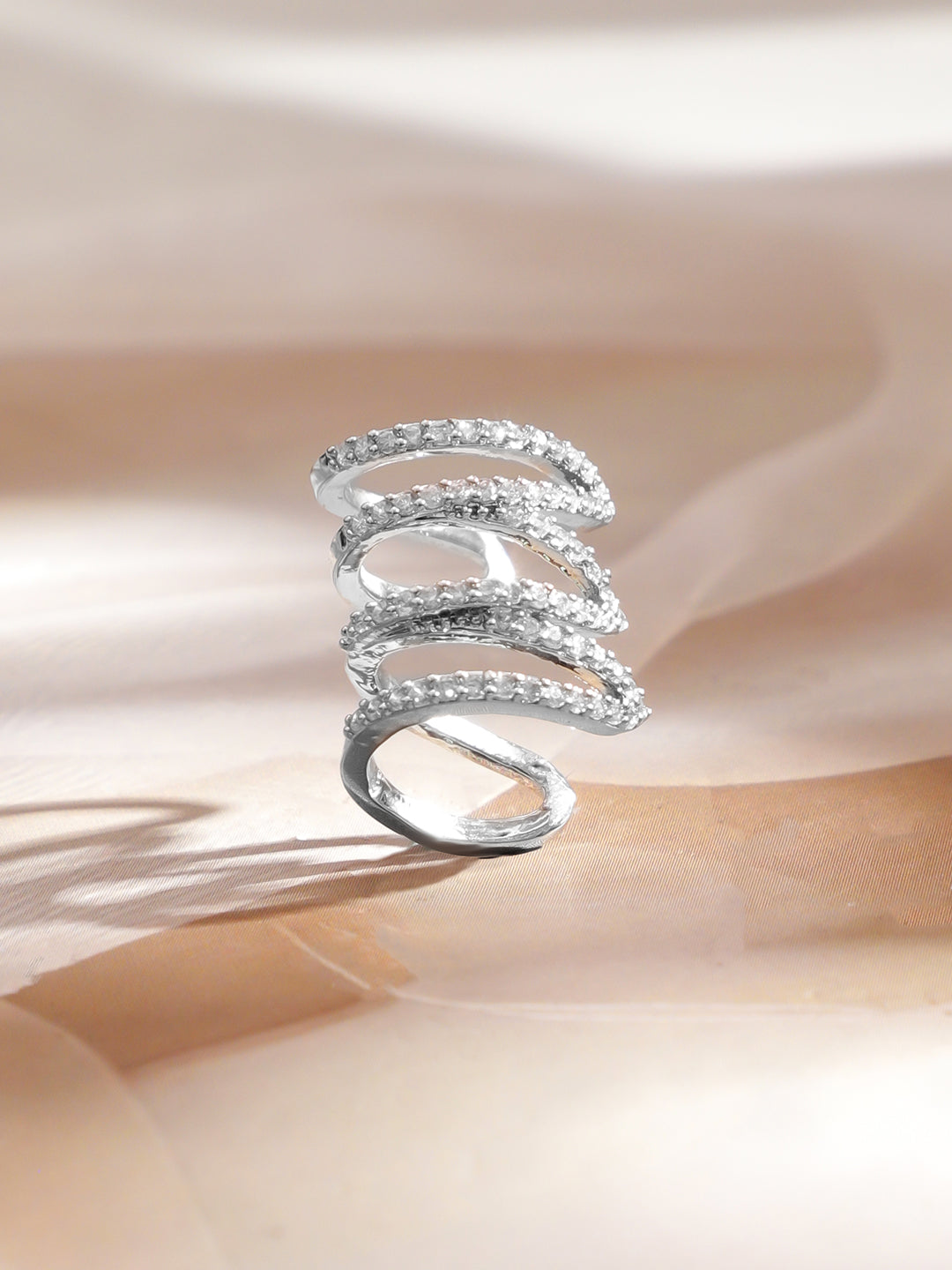 Ear Cuff: Rubans rhodium-plated stainless steel earcuff with multi-layer modern design, studded with sparkling Cubic Zirconia. Tarnish-free, waterproof and versatile for daily wear, party & classic styles.