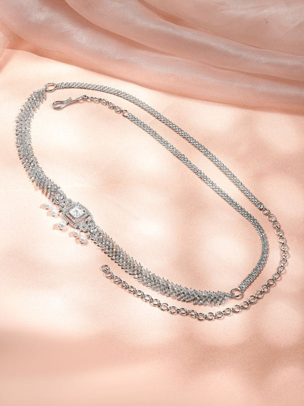Saree Accessories : This rhodium-plated kamarbandh features a central square-cut cubic zirconia with delicate white pearls and shimmering accents. A luxurious waist belt for women & girls, ideal for festive and wedding styling.