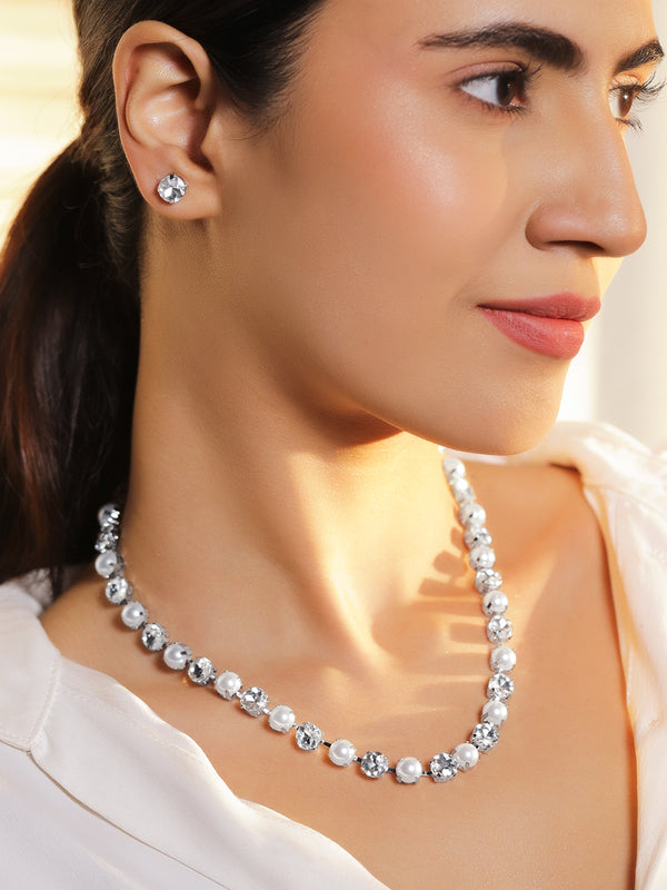 Necklace Set : Rubans rhodium-plated necklace set features alternating pearls and cubic zirconia stones, paired with matching earrings, crafted for timeless elegance in weddings, parties, and festive occasions.
