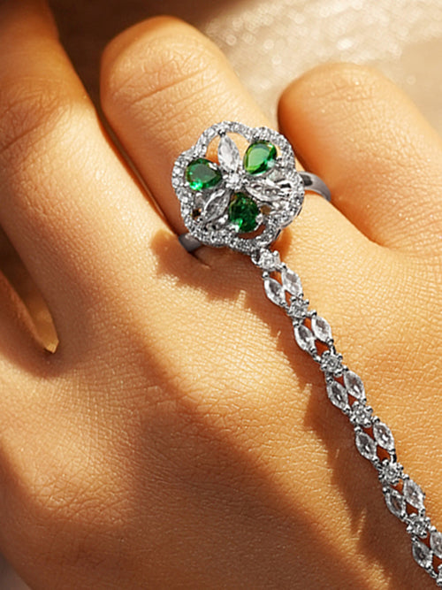 Rubans Hand Harness Bracelet with Ring for Women Rhodium Plated CZ and Emerald Green Bridal Wedding Party Jewellery for Women & Girls