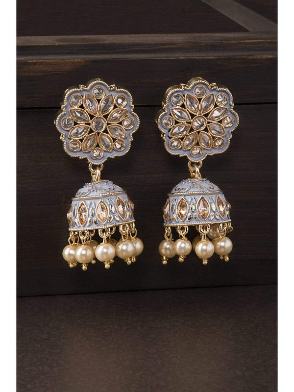 Rubans Gold Plated Grey Enamel AD Studded Pastel Statement Jhumka Earrings Earrings