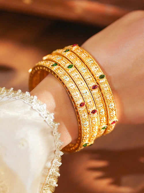 This 18K gold-plated brass bangle set of 4 features multicolour stones and pastel enamel accents, blending rich artistry with timeless festive elegance.