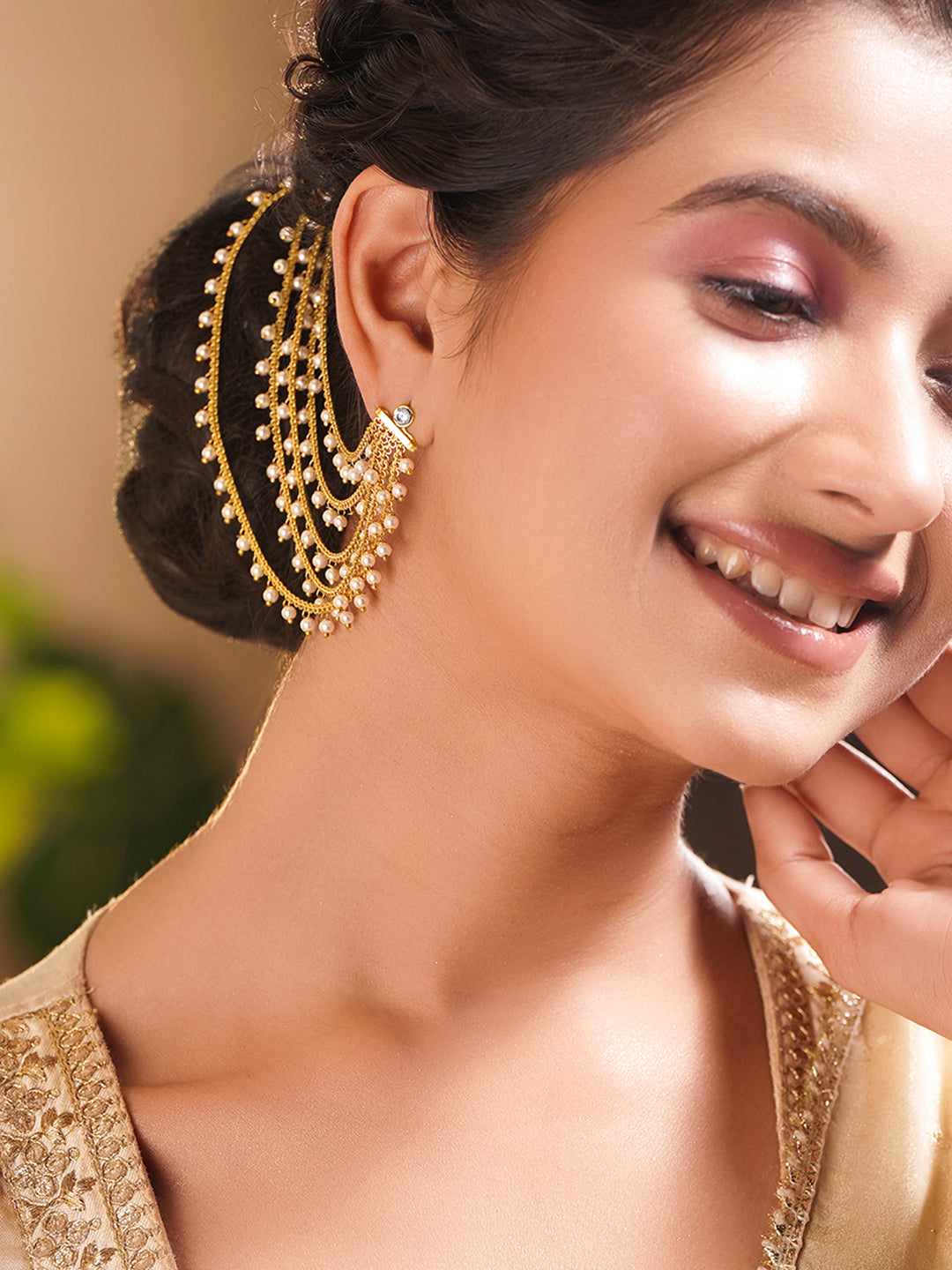 Share on WhatsappGold Plated Brass Pearl Multi Layer Ear Kaan Chain Earrings