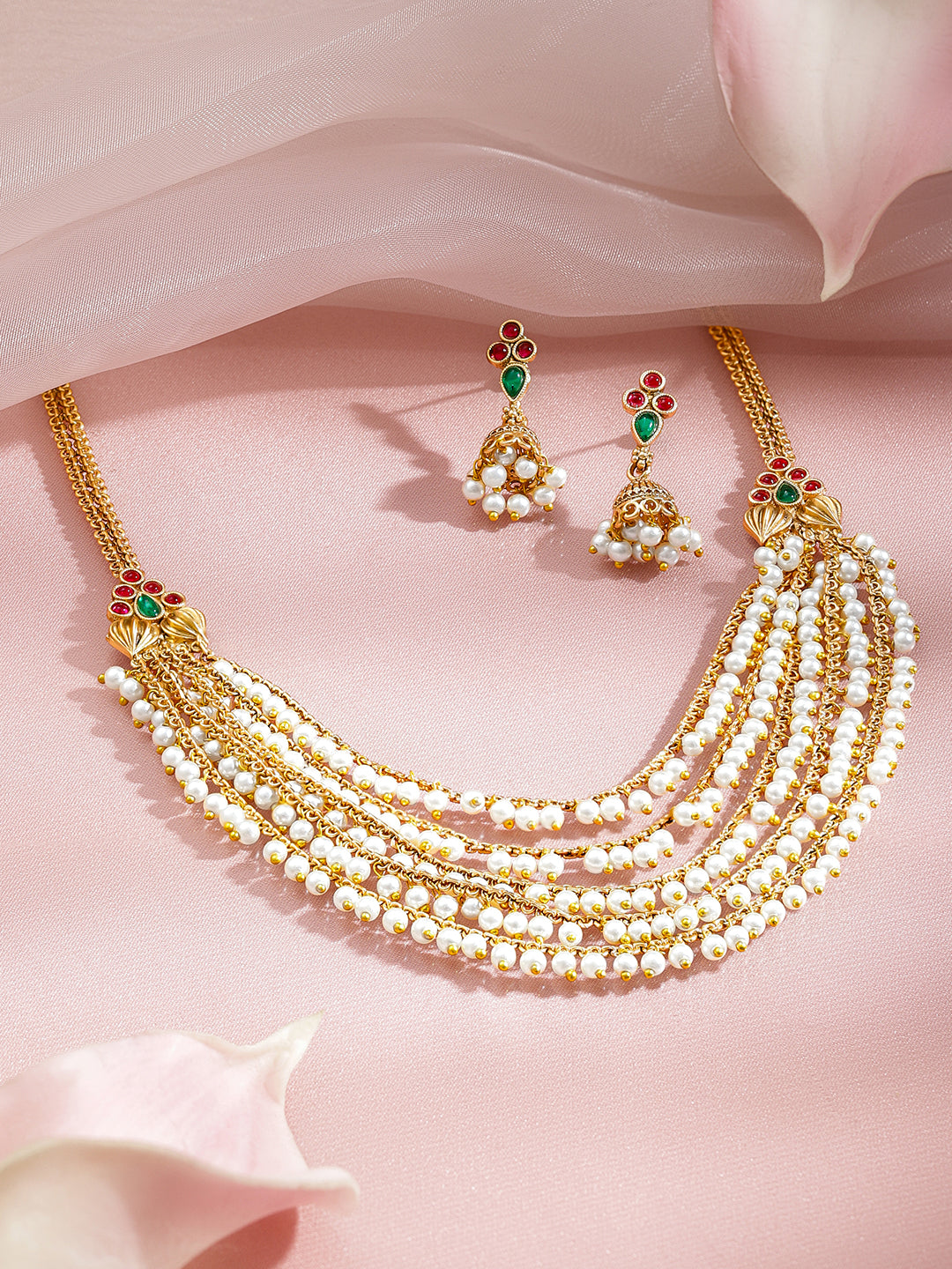 Rubans Multilayer Pearl Necklace Set with 22K Gold Plating and Enamel Floral Accents Stylish Festive & Partywear Jewellery for Women & Girls