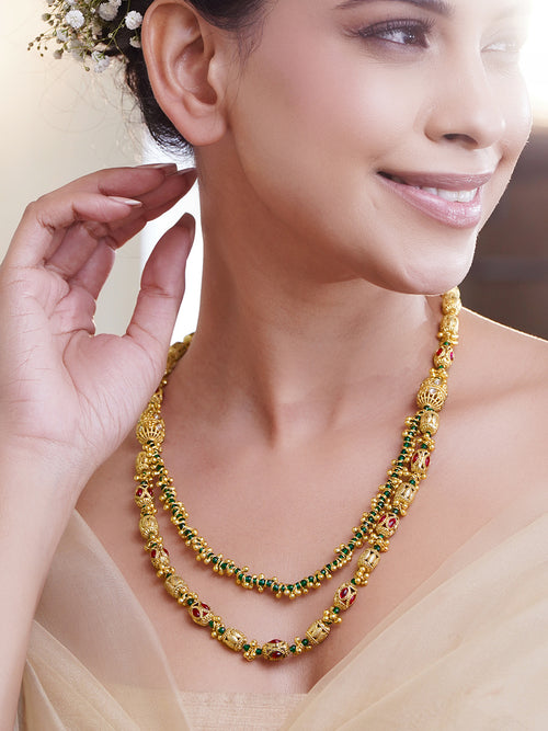 Rubans Necklace Set 18K Gold Plated Brass with Ruby Red Emerald Green and Golden Bead Detailing Traditional Wedding Festive Jewellery Set for Women & Girls