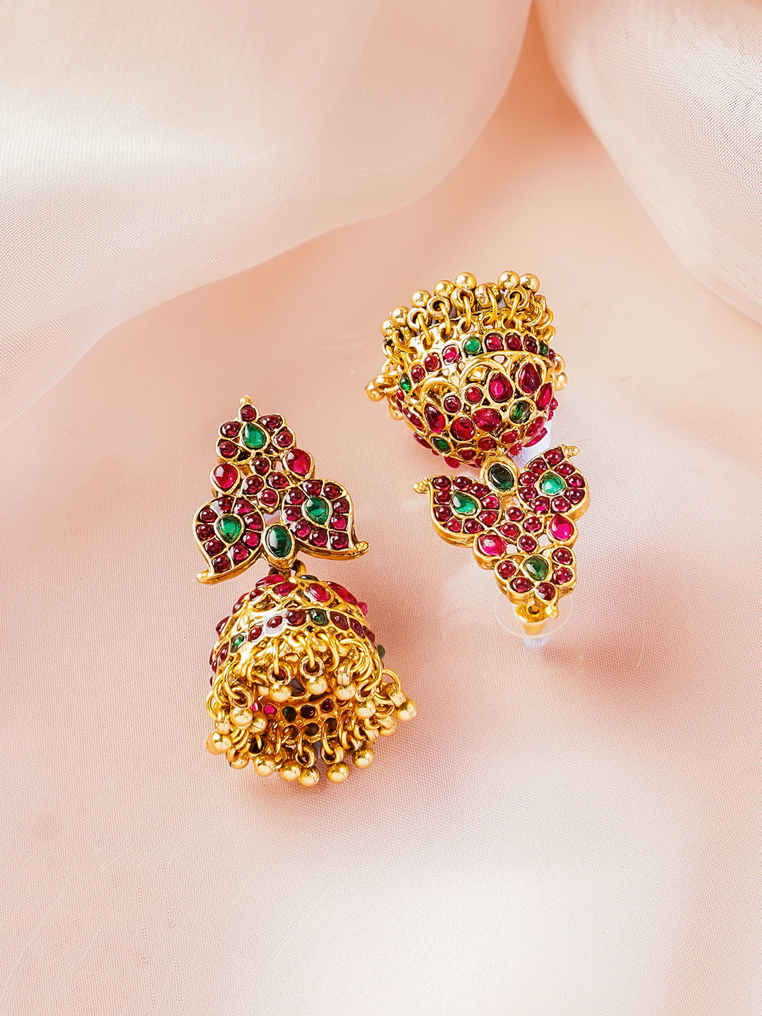 Expertly crafted in 22K Gold plated Brass this luxurious necklace set features ruby pink and emerald green Cubic Zirconia detailing with a refined statement silhouette perfect for weddings and grand celebrations