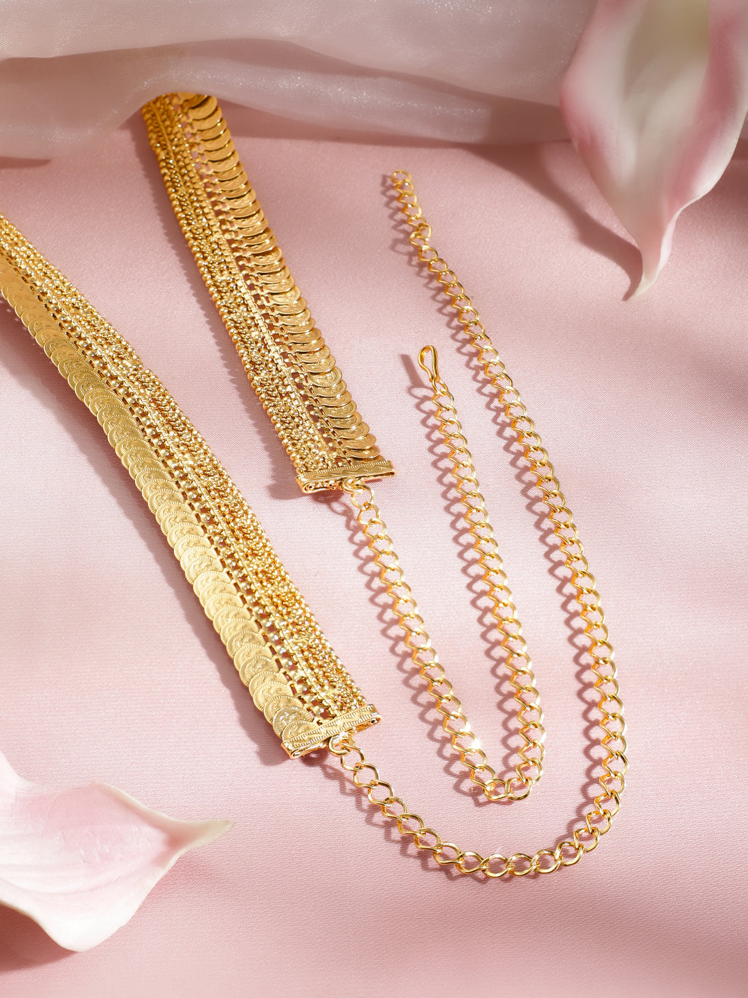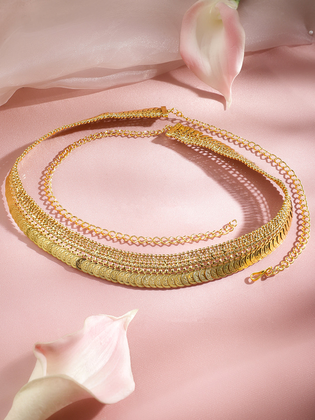 22K Gold plated Brass coin-design waist chain crafted for a rich traditional look, offering lightweight comfort perfect for bridal, festive and cultural celebrations.