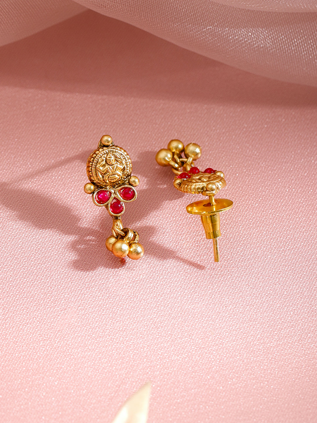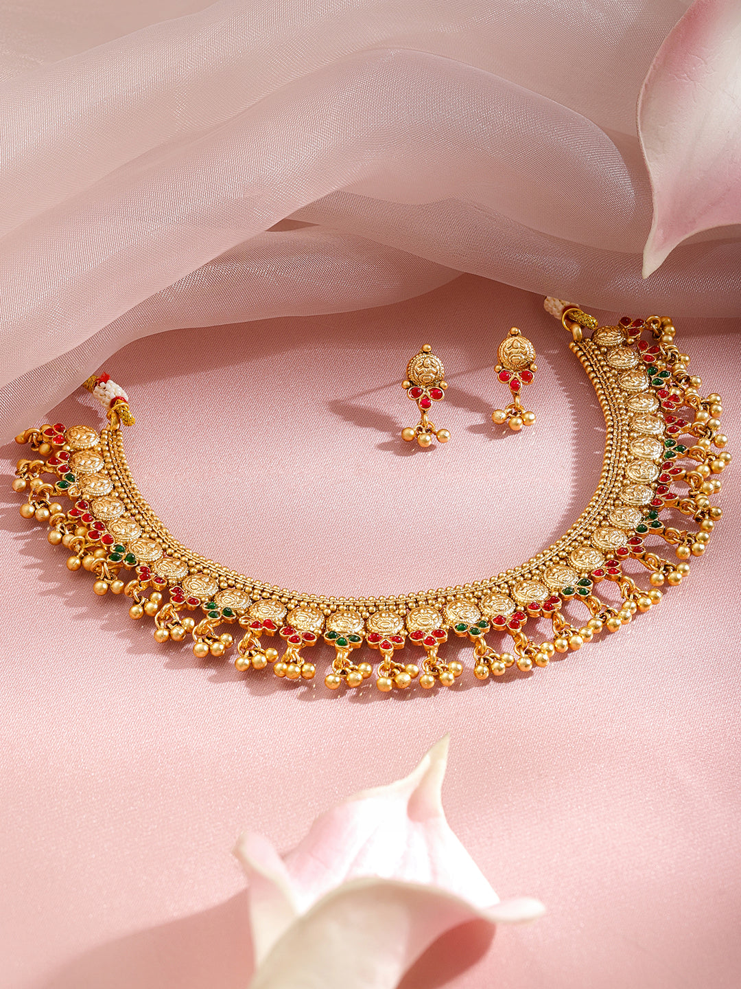 Crafted in 18K Gold plated Brass this temple style necklace set features ruby red and emerald green studded detailing with Gold bead hangings offering rich bridal elegance for weddings and festive occasions